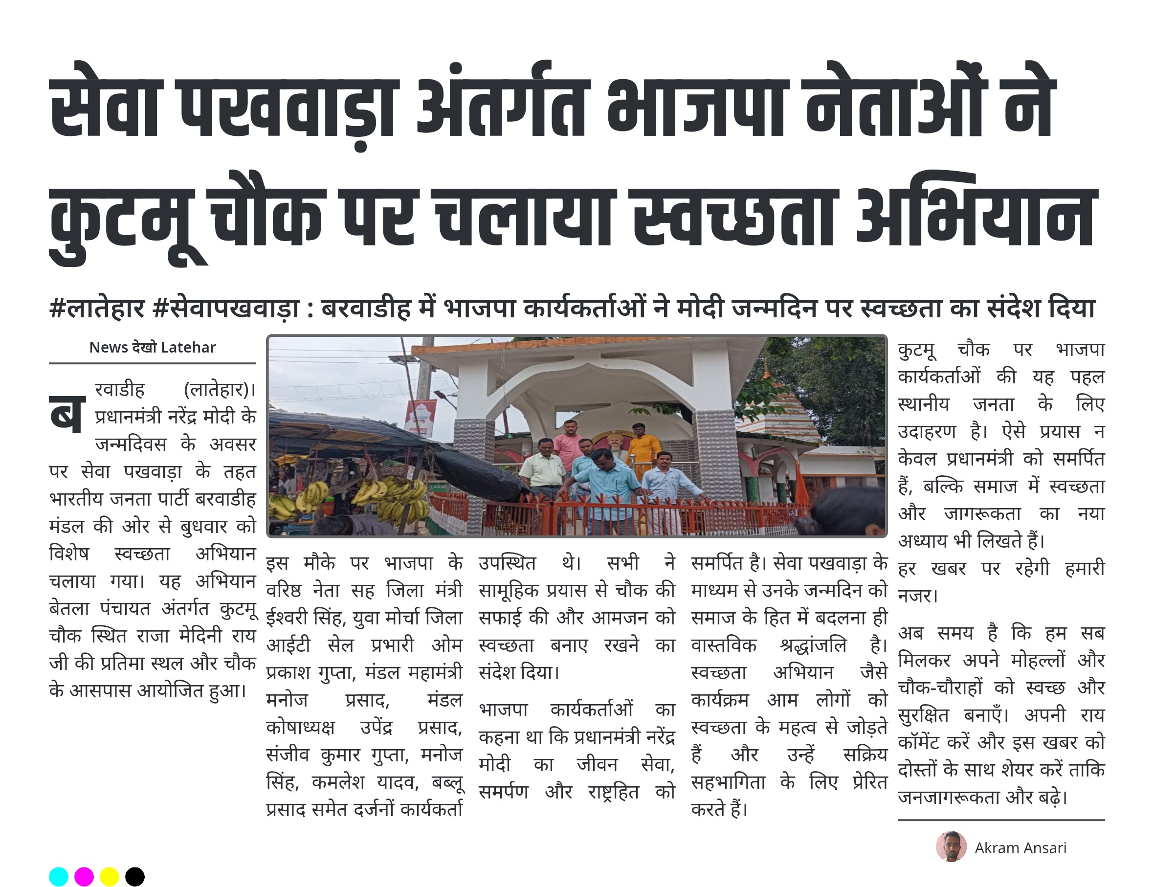 बरवाडीह (लातेहार)। प्रधानमंत्री नरेंद्र मोदी के जन्मदिवस के अवसर पर सेवा पखवाड़ा के तहत भारतीय जनता पार्टी बरवाडीह मंडल की ओर से बुधवार को विशेष स्वच्छता अभियान चलाया गया। यह अभियान बेतला पंचायत अंतर्गत कुटमू चौक स्थित राजा मेदिनी राय जी की प्रतिमा स्थल और चौक के आसपास आयोजित हुआ।
