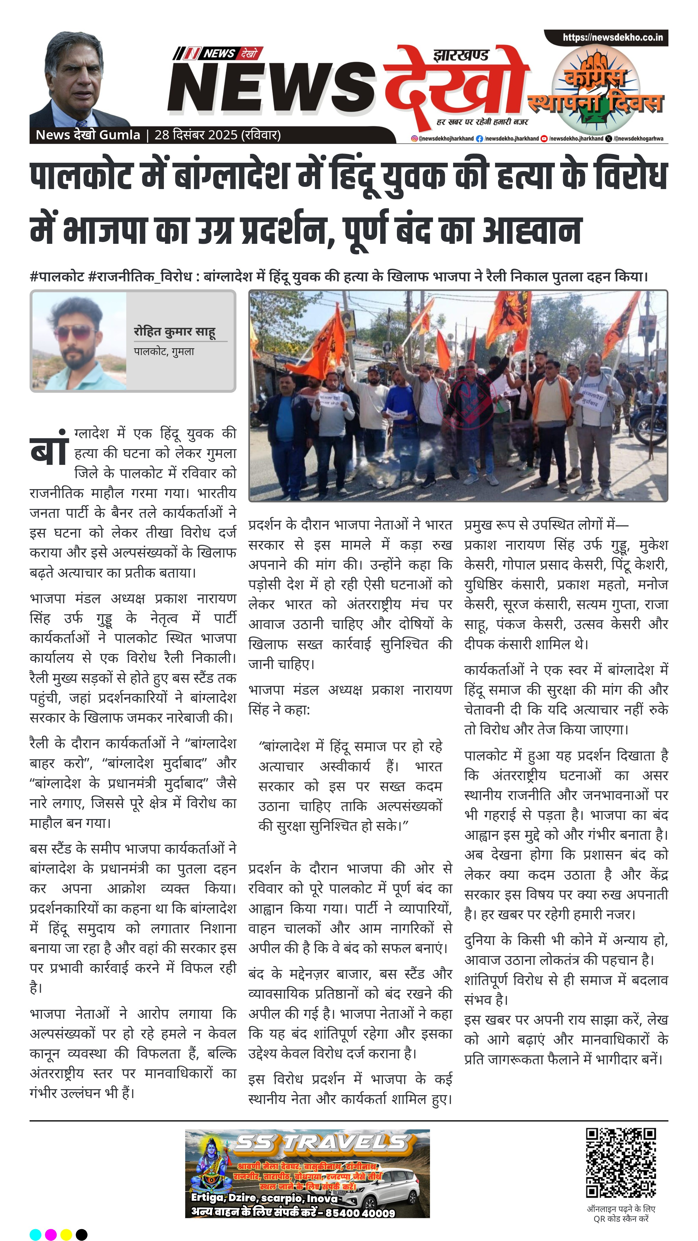 बांग्लादेश में एक हिंदू युवक की हत्या की घटना को लेकर गुमला जिले के पालकोट में रविवार को राजनीतिक माहौल गरमा गया। भारतीय जनता पार्टी के बैनर तले कार्यकर्ताओं ने इस घटना को लेकर तीखा विरोध दर्ज कराया और इसे अल्पसंख्यकों के खिलाफ बढ़ते अत्याचार का प्रतीक बताया।