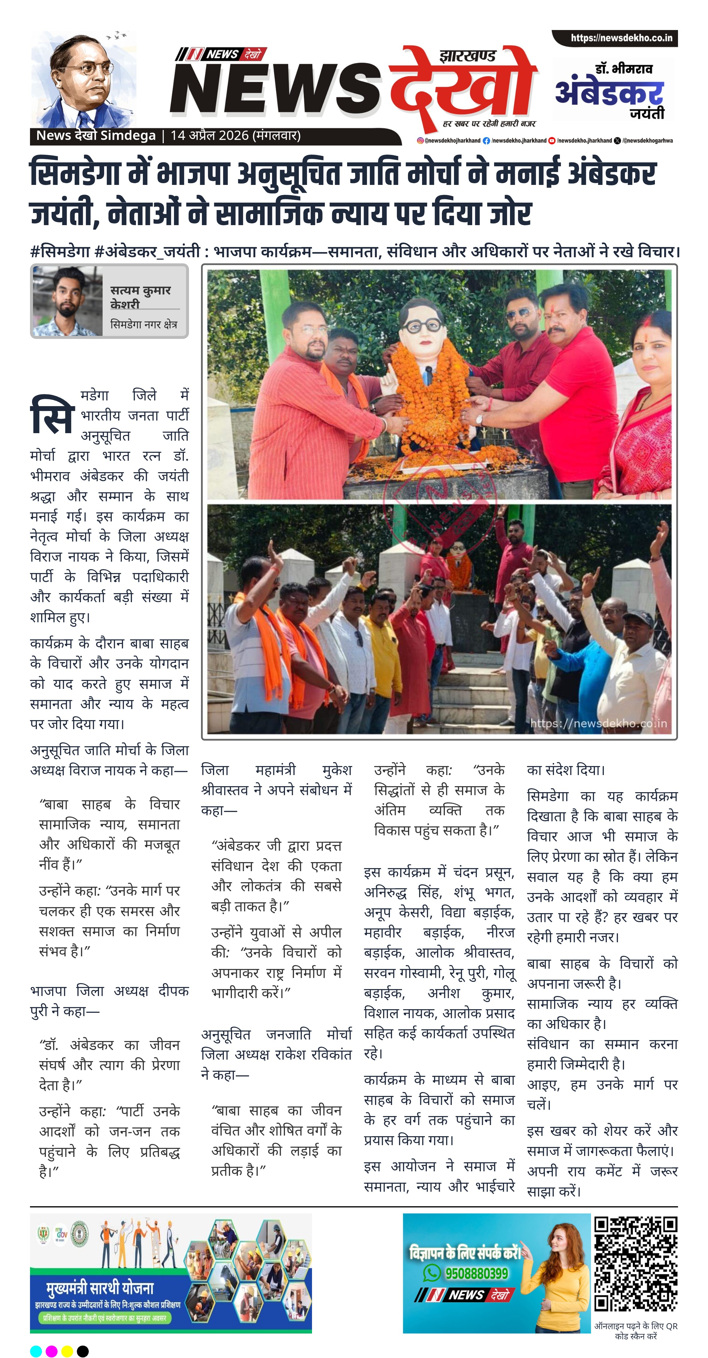 सिमडेगा जिले में भारतीय जनता पार्टी अनुसूचित जाति मोर्चा द्वारा भारत रत्न डॉ. भीमराव अंबेडकर की जयंती श्रद्धा और सम्मान के साथ मनाई गई। इस कार्यक्रम का नेतृत्व मोर्चा के जिला अध्यक्ष विराज नायक ने किया, जिसमें पार्टी के विभिन्न पदाधिकारी और कार्यकर्ता बड़ी संख्या में शामिल हुए।