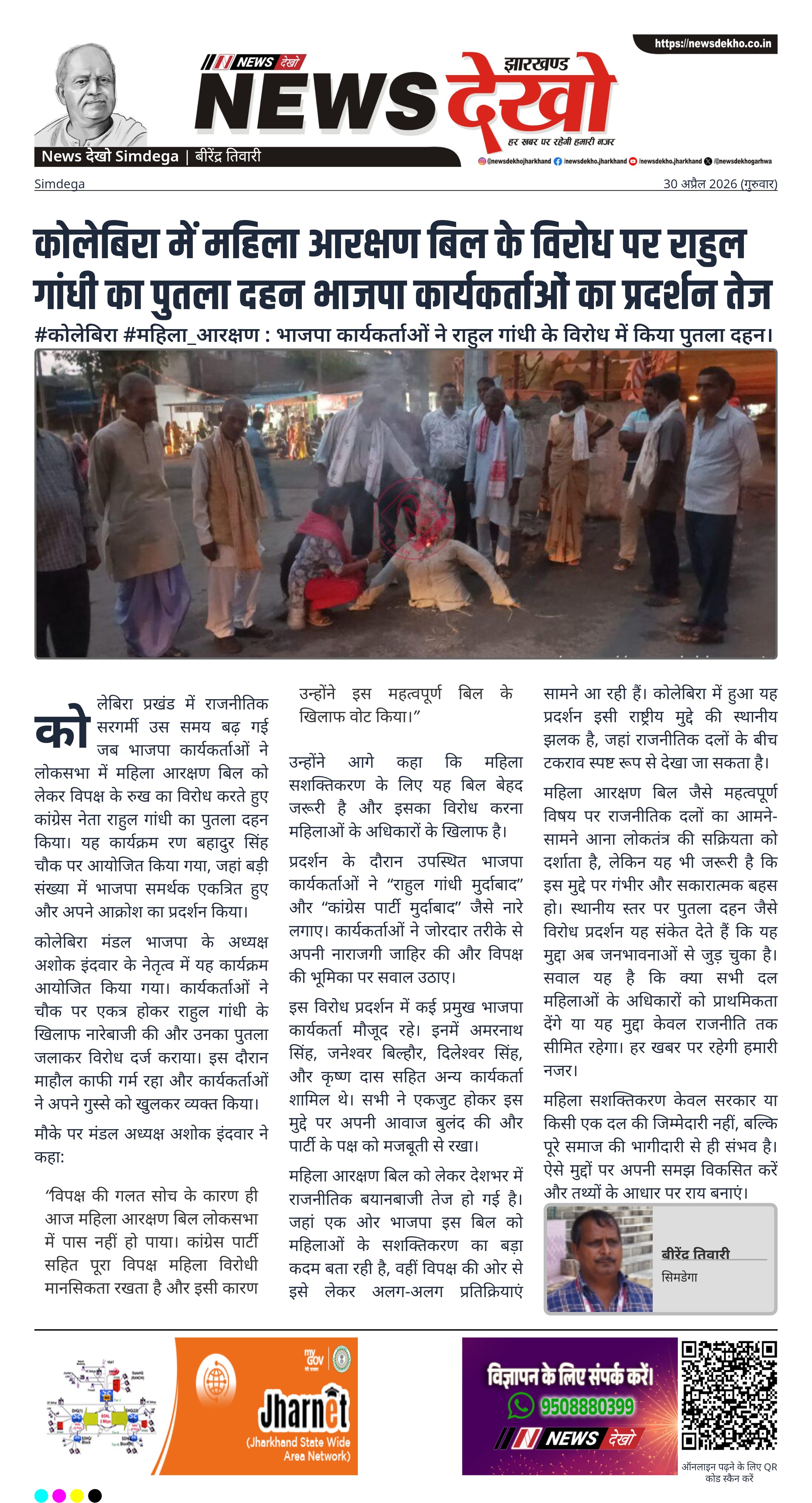 कोलेबिरा प्रखंड में राजनीतिक सरगर्मी उस समय बढ़ गई जब भाजपा कार्यकर्ताओं ने लोकसभा में महिला आरक्षण बिल को लेकर विपक्ष के रुख का विरोध करते हुए कांग्रेस नेता राहुल गांधी का पुतला दहन किया। यह कार्यक्रम रण बहादुर सिंह चौक पर आयोजित किया गया, जहां बड़ी संख्या में भाजपा समर्थक एकत्रित हुए और अपने आक्रोश का प्रदर्शन किया।