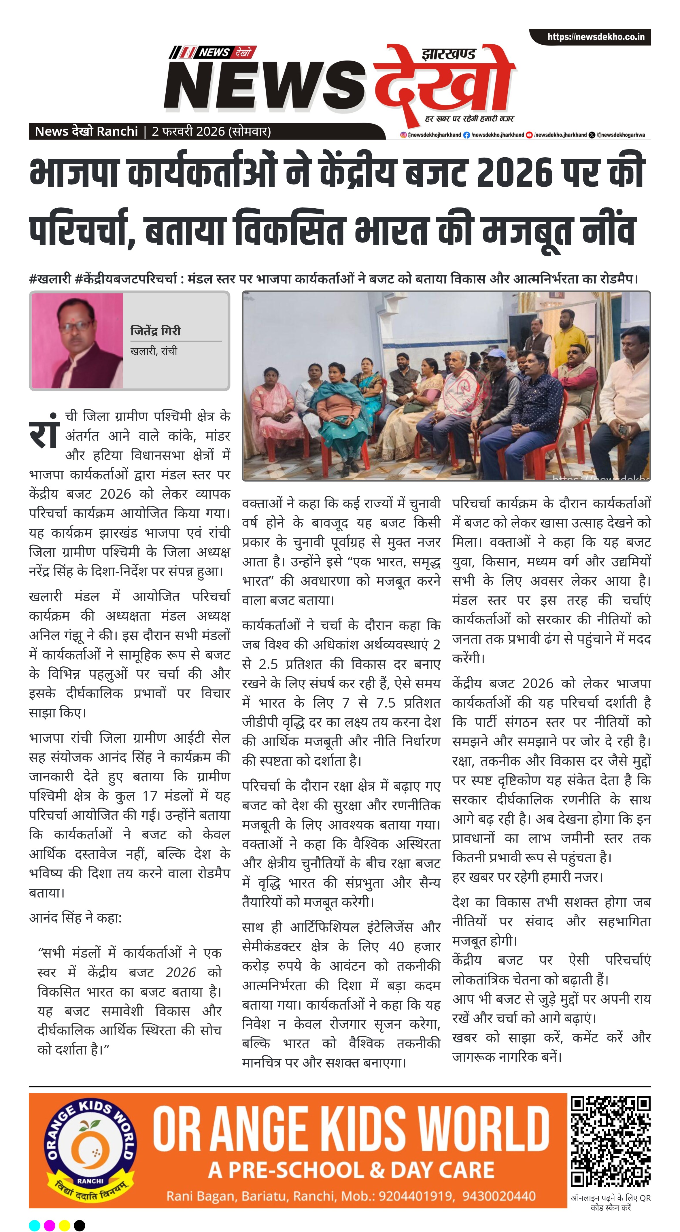 रांची जिले के खलारी प्रखंड सहित ग्रामीण पश्चिमी क्षेत्र के विभिन्न मंडलों में भाजपा कार्यकर्ताओं ने केंद्रीय बजट 2026 को लेकर परिचर्चा कार्यक्रम आयोजित किया। यह आयोजन झारखंड भाजपा और रांची जिला ग्रामीण पश्चिमी के जिला अध्यक्ष के दिशा-निर्देश पर हुआ। कार्यक्रम में बजट के प्रमुख प्रावधानों, विकास लक्ष्यों और आर्थिक दृष्टिकोण पर सामूहिक चर्चा की गई। वक्ताओं ने बजट को विकसित भारत की दिशा में एक संतुलित और दूरदर्शी दस्तावेज बताया।