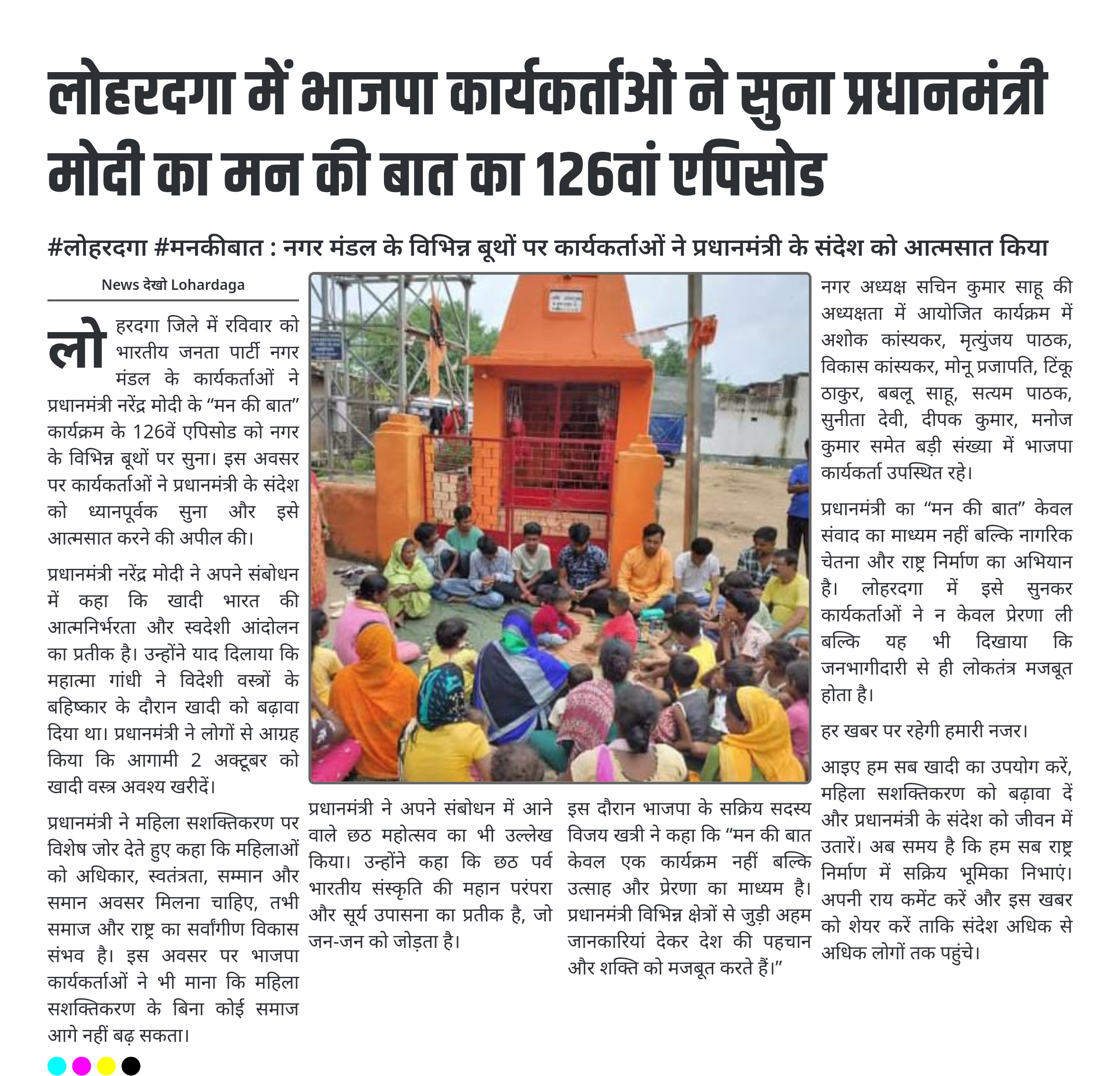 लोहरदगा जिले में रविवार को भारतीय जनता पार्टी नगर मंडल के कार्यकर्ताओं ने प्रधानमंत्री नरेंद्र मोदी के “मन की बात” कार्यक्रम के 126वें एपिसोड को नगर के विभिन्न बूथों पर सुना। इस अवसर पर कार्यकर्ताओं ने प्रधानमंत्री के संदेश को ध्यानपूर्वक सुना और इसे आत्मसात करने की अपील की।