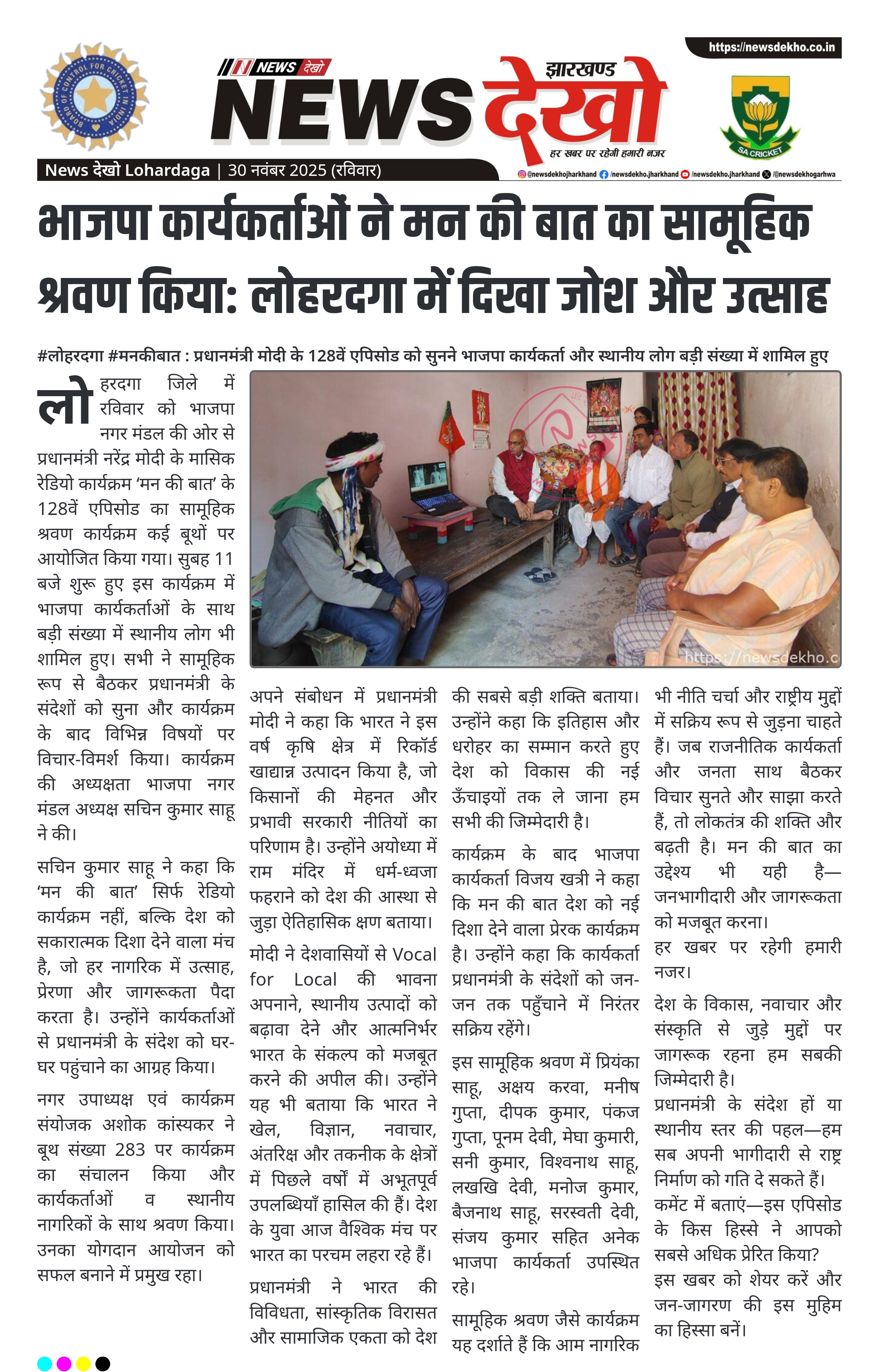 - भाजपा नगर मंडल, लोहरदगा की ओर से विभिन्न बूथों पर सामूहिक श्रवण कार्यक्रम आयोजित।