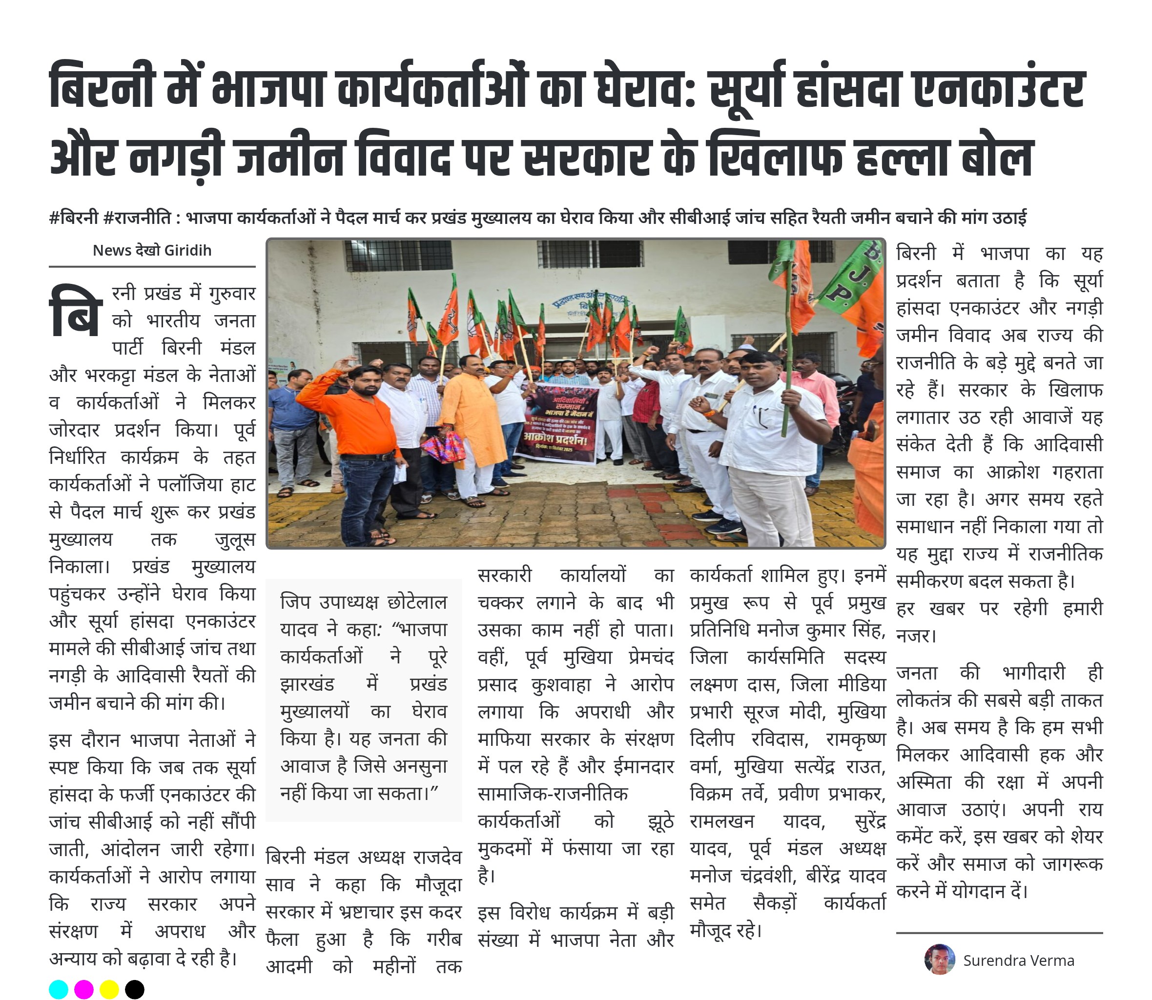बिरनी में भाजपा का यह प्रदर्शन बताता है कि सूर्या हांसदा एनकाउंटर और नगड़ी जमीन विवाद अब राज्य की राजनीति के बड़े मुद्दे बनते जा रहे हैं। सरकार के खिलाफ लगातार उठ रही आवाजें यह संकेत देती हैं कि आदिवासी समाज का आक्रोश गहराता जा रहा है। अगर समय रहते समाधान नहीं निकाला गया तो यह मुद्दा राज्य में राजनीतिक समीकरण बदल सकता है।