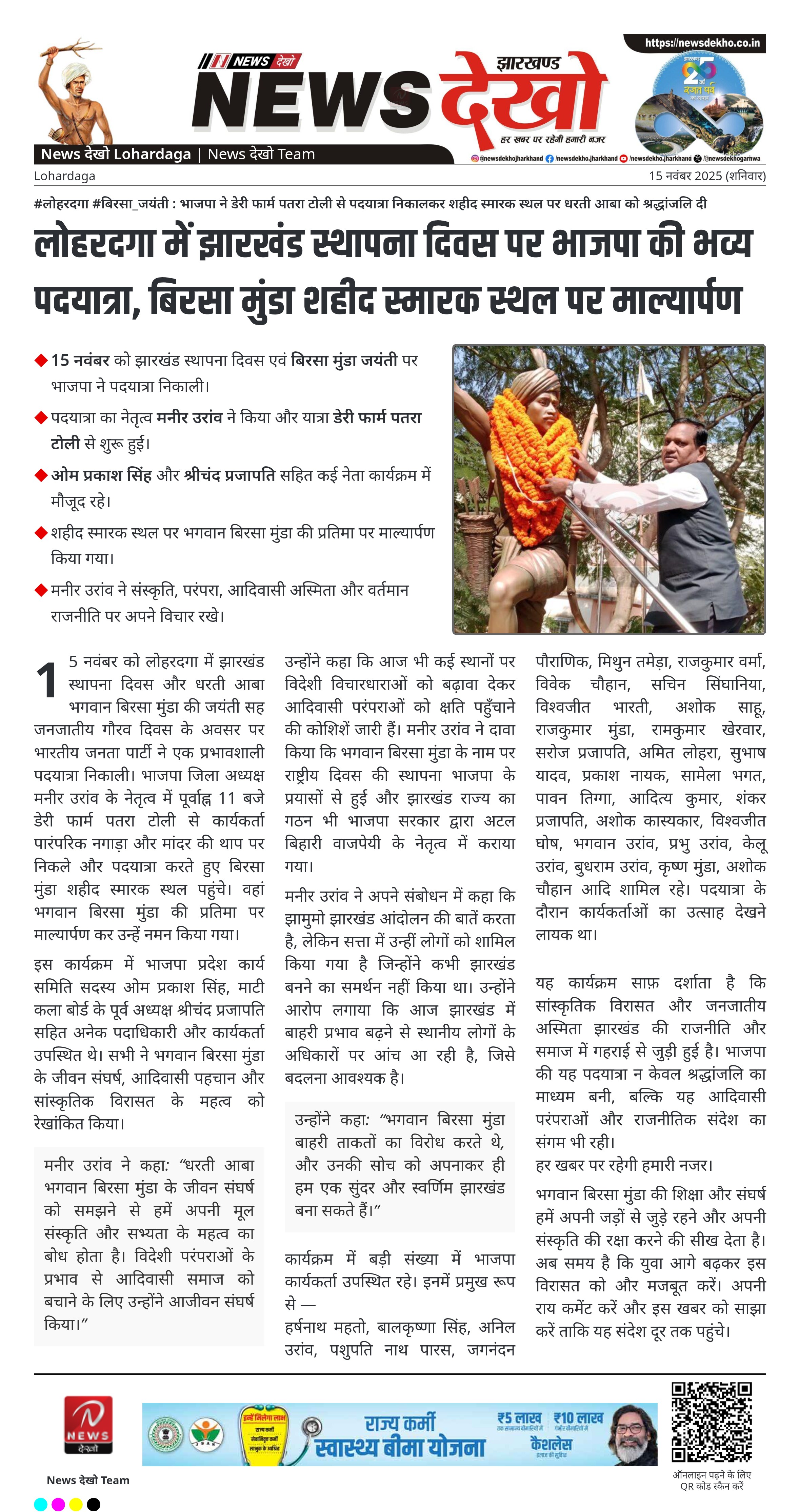 - 15 नवंबर को झारखंड स्थापना दिवस एवं बिरसा मुंडा जयंती पर भाजपा ने पदयात्रा निकाली।