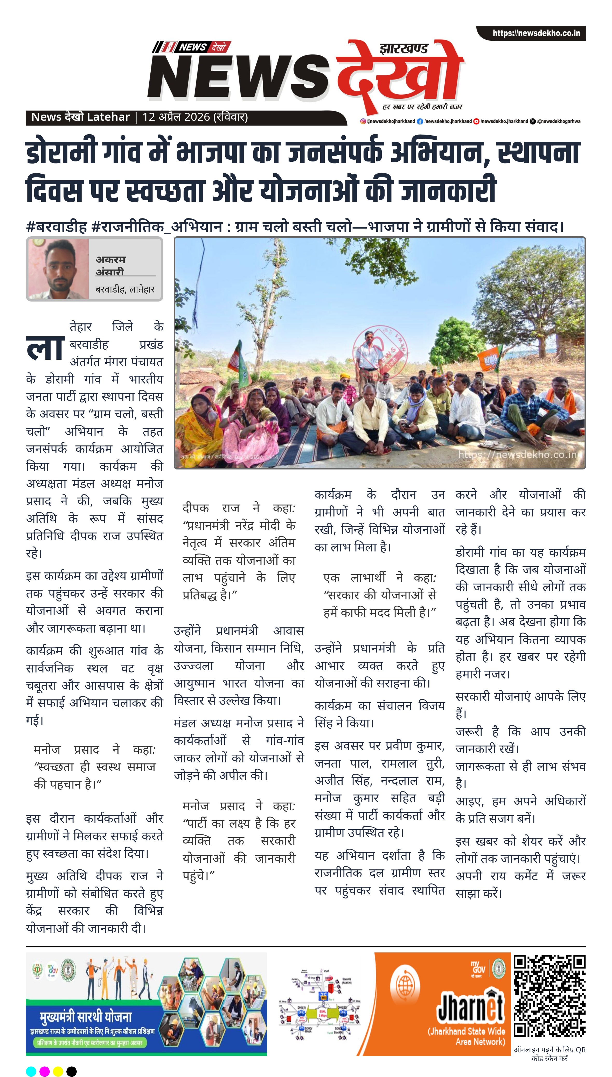 लातेहार के बरवाडीह प्रखंड के डोरामी गांव में भाजपा ने स्थापना दिवस पर जनसंपर्क अभियान चलाया। कार्यक्रम में स्वच्छता अभियान और सरकारी योजनाओं की जानकारी दी गई। ग्रामीणों ने योजनाओं के लाभ पर आभार जताया। अभियान में कई नेता और कार्यकर्ता शामिल हुए।