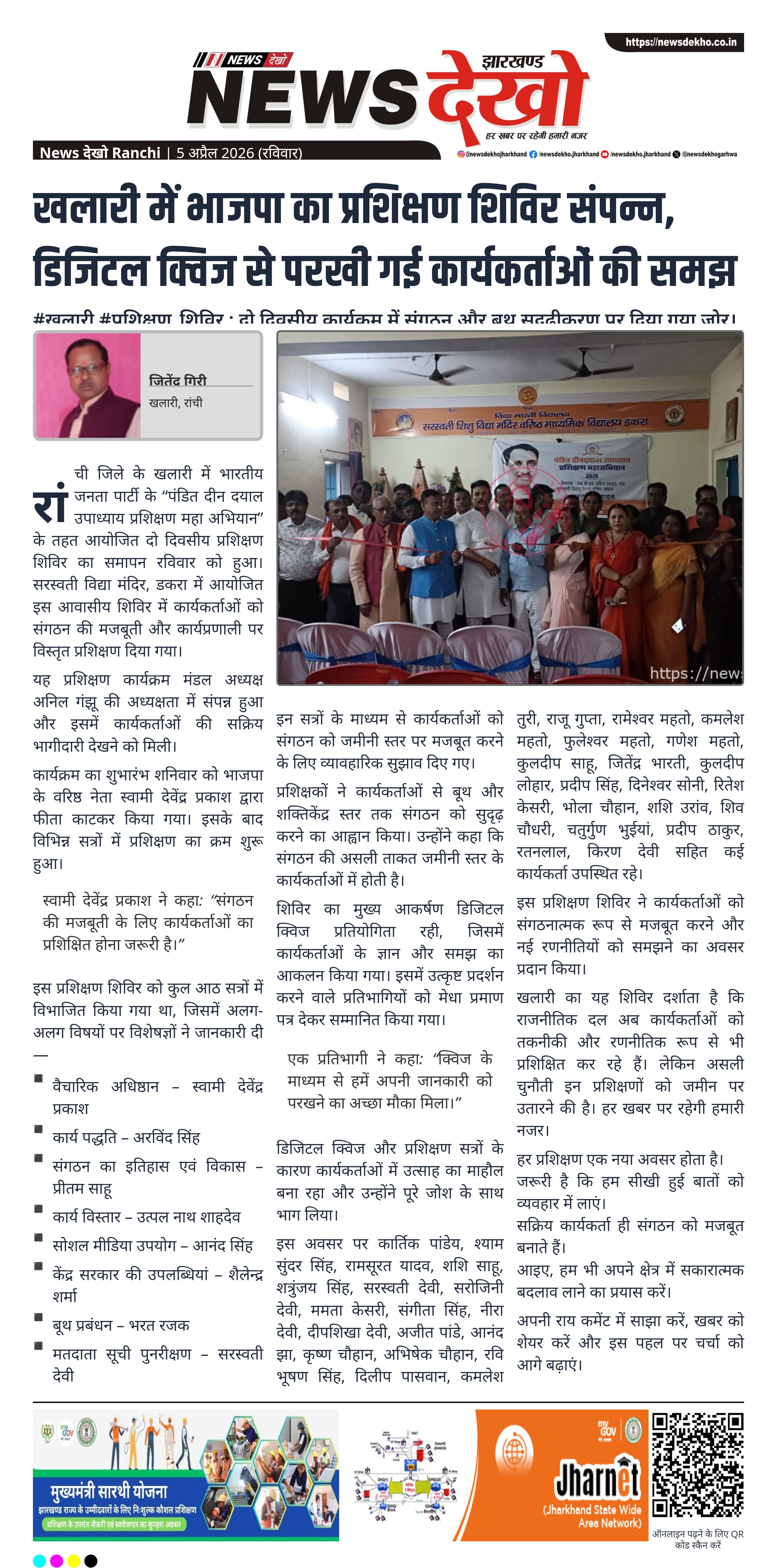रांची जिले के खलारी में भारतीय जनता पार्टी के “पंडित दीन दयाल उपाध्याय प्रशिक्षण महा अभियान” के तहत आयोजित दो दिवसीय प्रशिक्षण शिविर का समापन रविवार को हुआ। सरस्वती विद्या मंदिर, डकरा में आयोजित इस आवासीय शिविर में कार्यकर्ताओं को संगठन की मजबूती और कार्यप्रणाली पर विस्तृत प्रशिक्षण दिया गया।