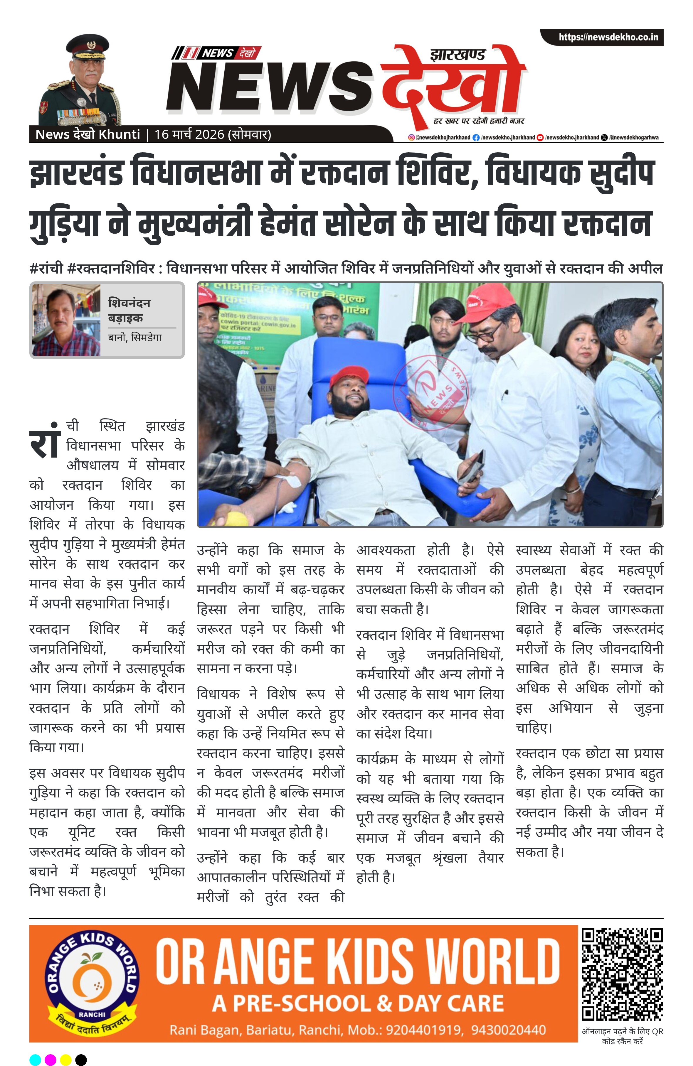 रांची स्थित झारखंड विधानसभा परिसर के औषधालय में आयोजित रक्तदान शिविर में तोरपा विधायक सुदीप गुड़िया ने मुख्यमंत्री हेमंत सोरेन के साथ रक्तदान किया। इस दौरान उन्होंने रक्तदान को महादान बताते हुए समाज के सभी वर्गों और विशेष रूप से युवाओं से नियमित रूप से रक्तदान करने की अपील की।