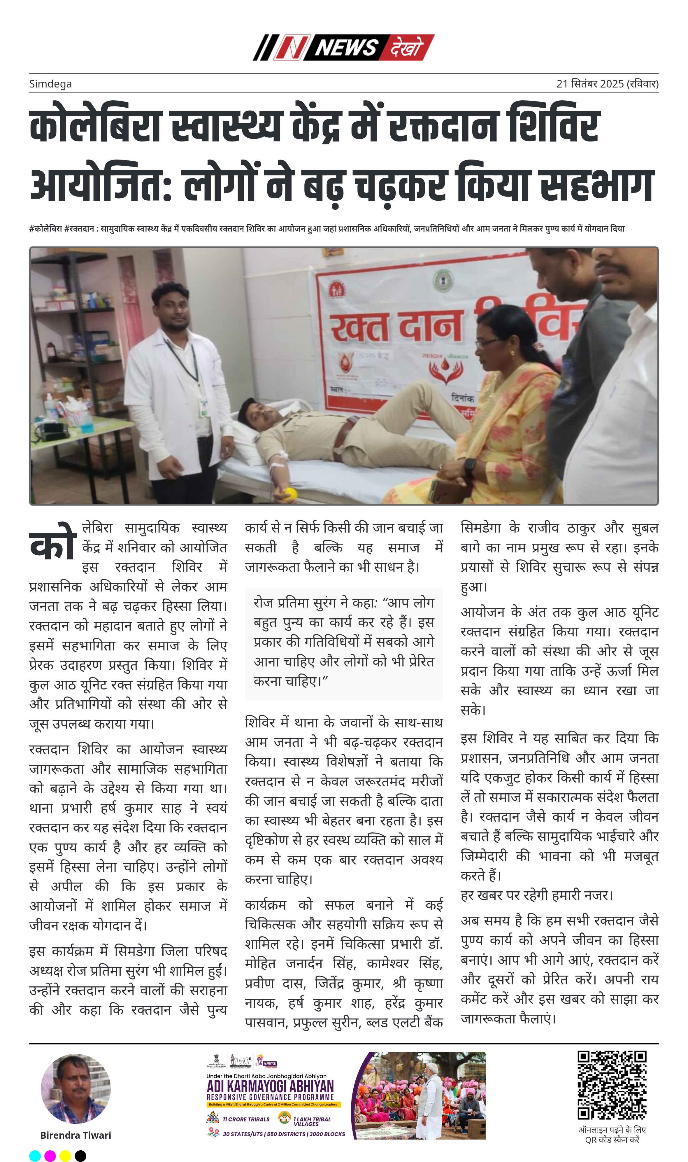 - कोलेबिरा सामुदायिक स्वास्थ्य केंद्र में एकदिवसीय रक्तदान शिविर का आयोजन।