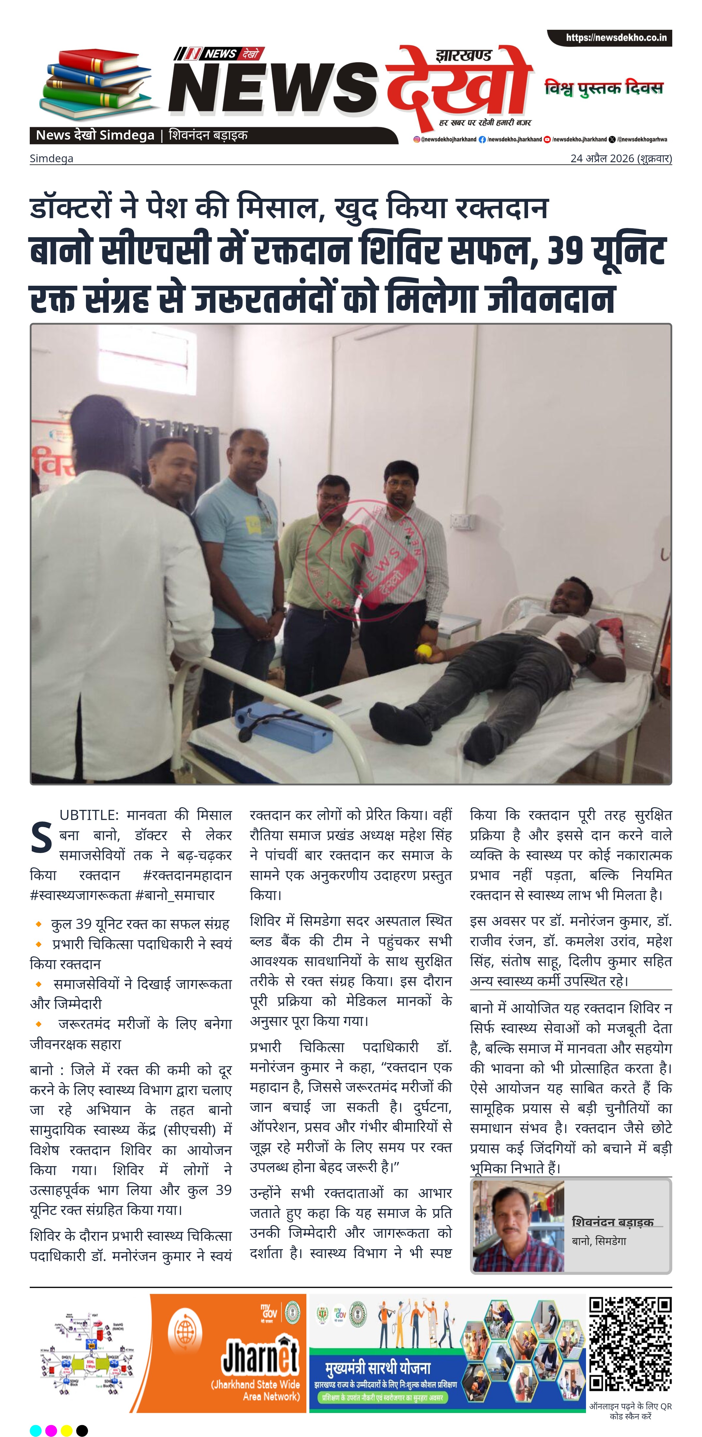 जिले में रक्त की कमी को दूर करने के उद्देश्य से बानो सामुदायिक स्वास्थ्य केंद्र में आयोजित रक्तदान शिविर में लोगों ने बढ़-चढ़कर हिस्सा लिया। इस दौरान कुल 39 यूनिट रक्त संग्रह किया गया। डॉक्टरों और समाजसेवियों की भागीदारी ने इस अभियान को प्रेरणादायक बना दिया।
