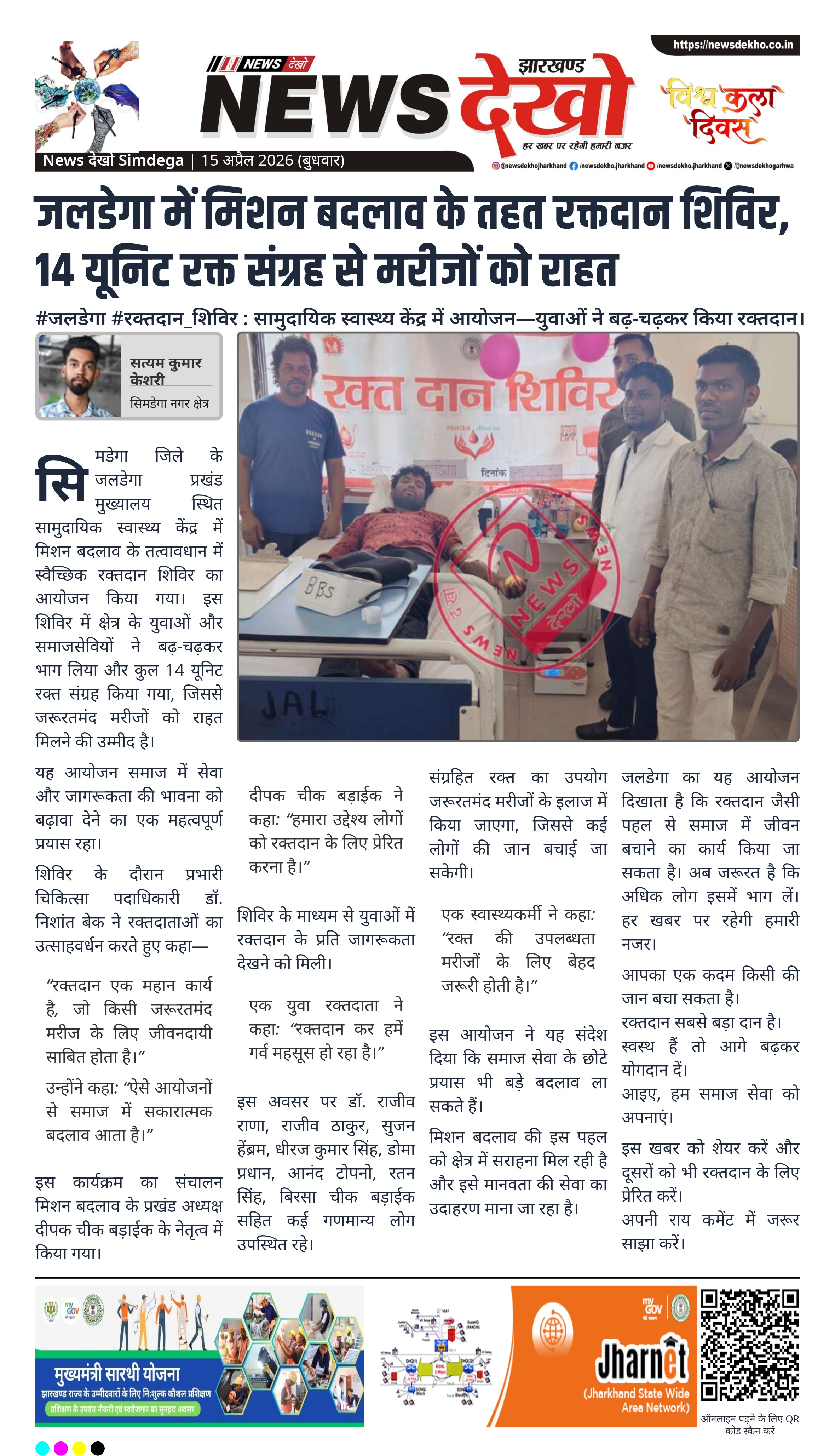 सिमडेगा के जलडेगा में मिशन बदलाव द्वारा रक्तदान शिविर आयोजित किया गया। शिविर में 14 यूनिट रक्त संग्रह किया गया। डॉक्टरों ने रक्तदान को जीवनदायी बताया। कार्यक्रम में युवाओं और समाजसेवियों की सक्रिय भागीदारी रही।