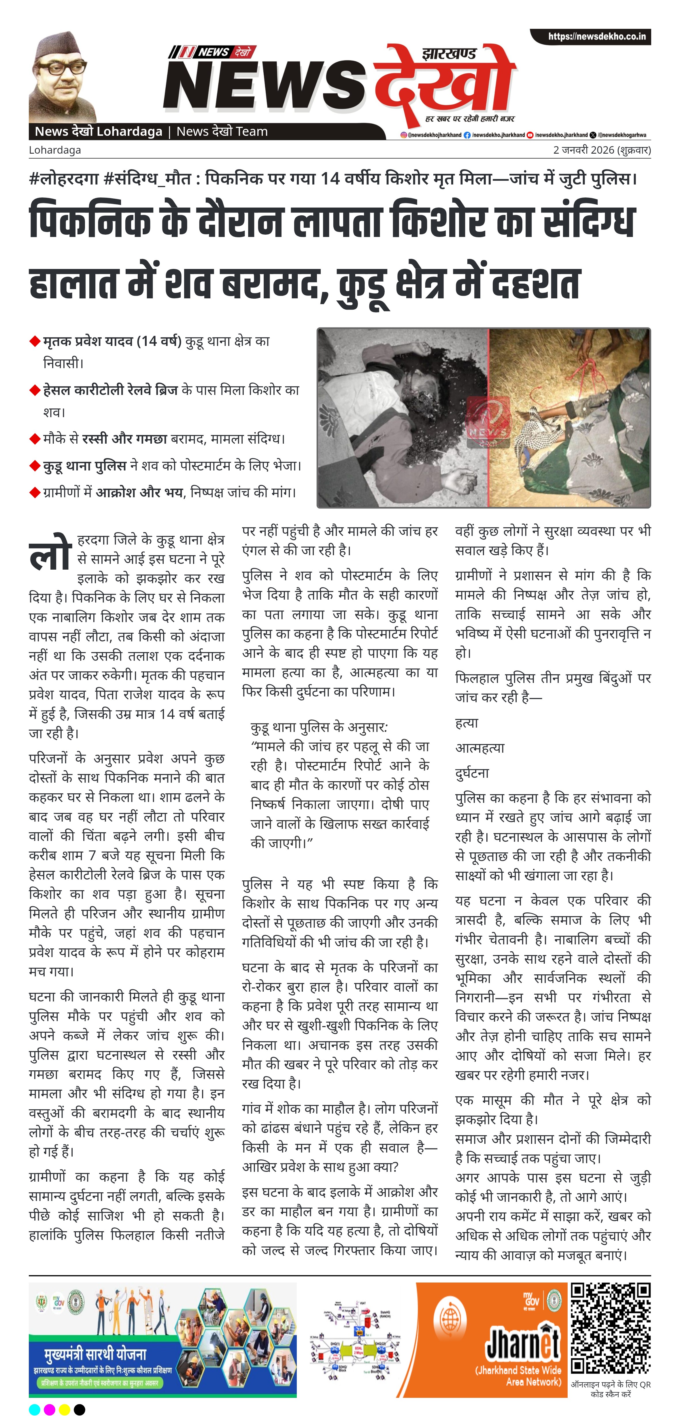 लोहरदगा जिले के कुडू थाना क्षेत्र से सामने आई इस घटना ने पूरे इलाके को झकझोर कर रख दिया है। पिकनिक के लिए घर से निकला एक नाबालिग किशोर जब देर शाम तक वापस नहीं लौटा, तब किसी को अंदाजा नहीं था कि उसकी तलाश एक दर्दनाक अंत पर जाकर रुकेगी। मृतक की पहचान प्रवेश यादव, पिता राजेश यादव के रूप में हुई है, जिसकी उम्र मात्र 14 वर्ष बताई जा रही है।