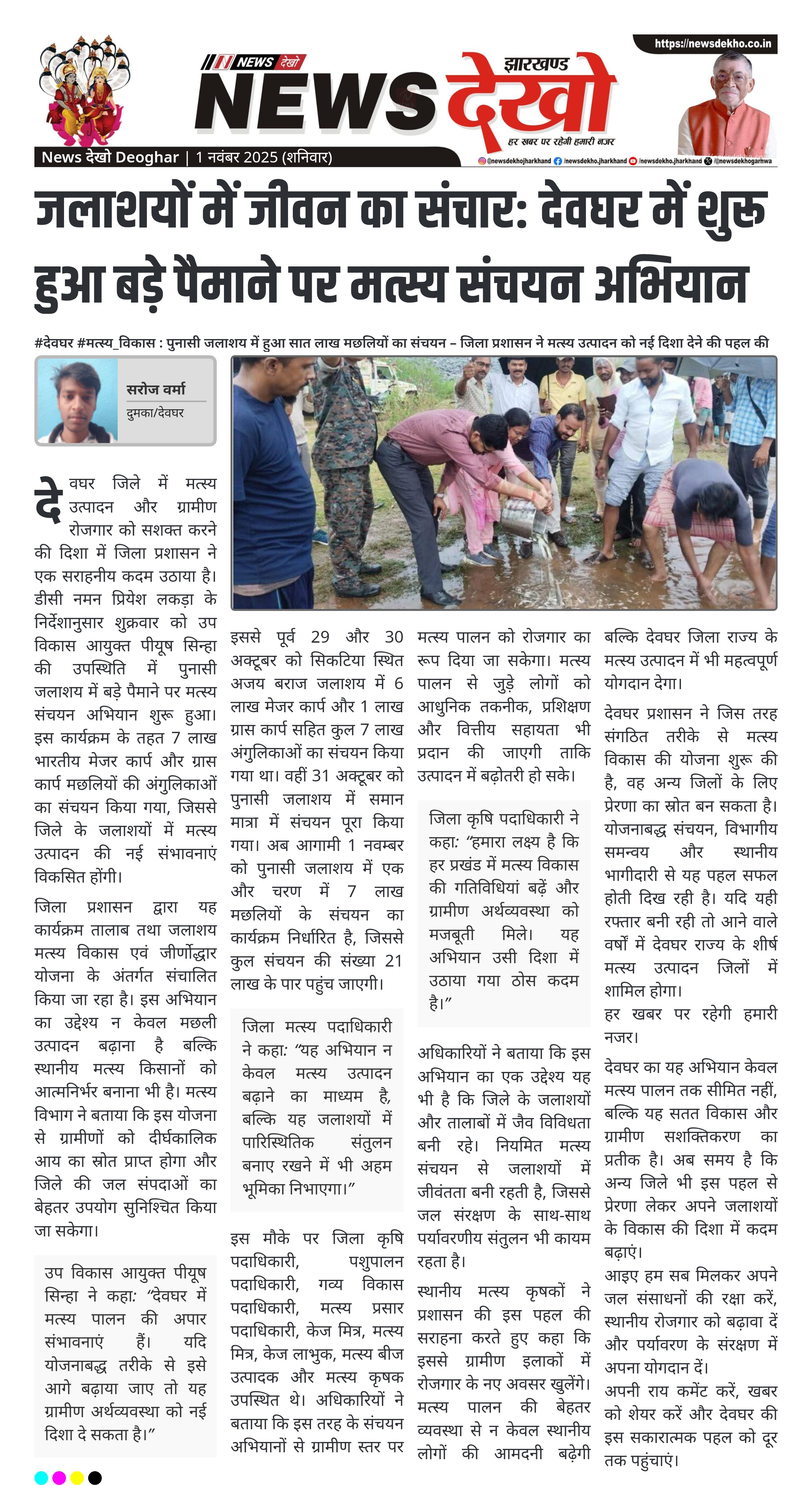 देवघर प्रशासन ने जिस तरह संगठित तरीके से मत्स्य विकास की योजना शुरू की है, वह अन्य जिलों के लिए प्रेरणा का स्रोत बन सकता है। योजनाबद्ध संचयन, विभागीय समन्वय और स्थानीय भागीदारी से यह पहल सफल होती दिख रही है। यदि यही रफ्तार बनी रही तो आने वाले वर्षों में देवघर राज्य के शीर्ष मत्स्य उत्पादन जिलों में शामिल होगा।