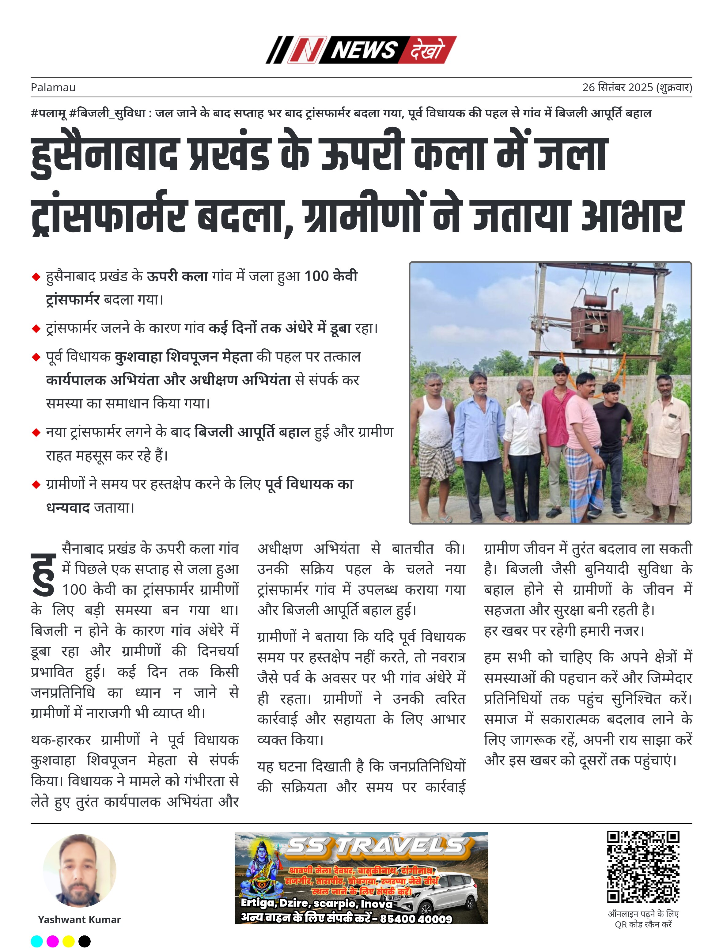- हुसैनाबाद प्रखंड के ऊपरी कला गांव में जला हुआ 100 केवी ट्रांसफार्मर बदला गया।