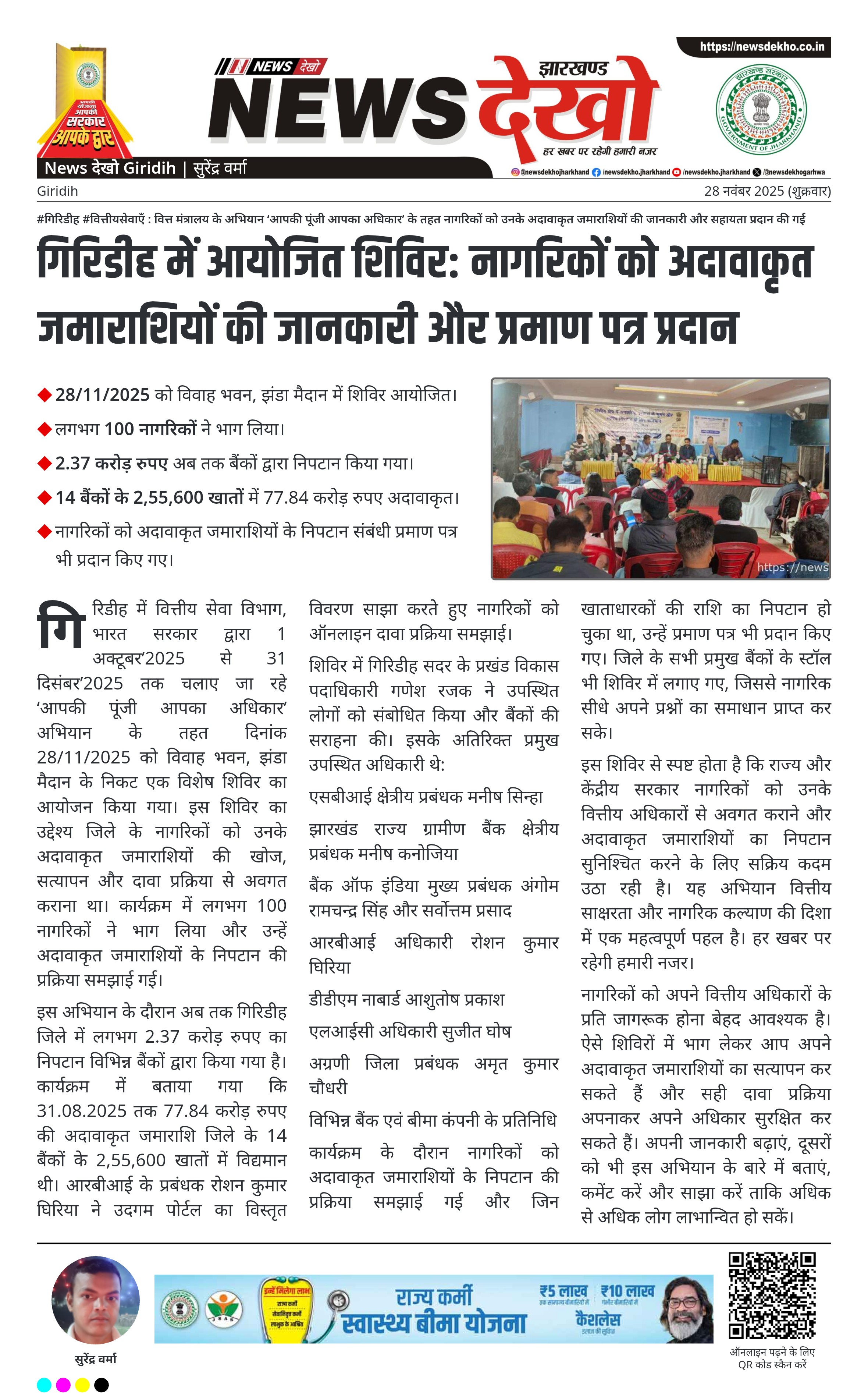 गिरिडीह में वित्तीय सेवा विभाग, भारत सरकार द्वारा 1 अक्टूबर’2025 से 31 दिसंबर’2025 तक चलाए जा रहे ‘आपकी पूंजी आपका अधिकार’ अभियान के तहत दिनांक 28/11/2025 को विवाह भवन, झंडा मैदान के निकट एक विशेष शिविर का आयोजन किया गया। इस शिविर का उद्देश्य जिले के नागरिकों को उनके अदावाकृत जमाराशियों की खोज, सत्यापन और दावा प्रक्रिया से अवगत कराना था। कार्यक्रम में लगभग 100 नागरिकों ने भाग लिया और उन्हें अदावाकृत जमाराशियों के निपटान की प्रक्रिया समझाई गई।