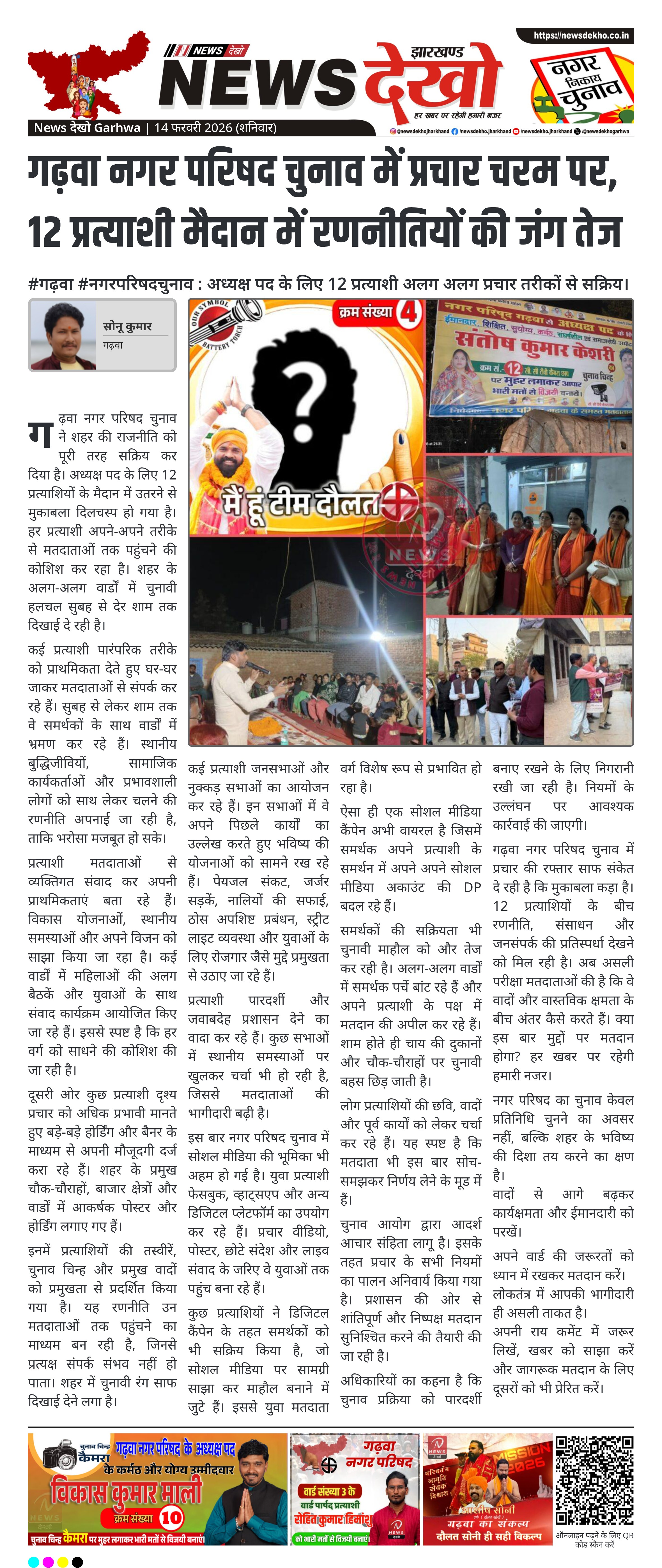 गढ़वा नगर परिषद चुनाव को लेकर शहर का राजनीतिक माहौल तेज हो गया है। अध्यक्ष पद के लिए 12 प्रत्याशी मैदान में उतरकर अलग-अलग रणनीतियों के साथ मतदाताओं को साधने में जुटे हैं। वार्ड स्तर पर डोर-टू-डोर संपर्क, जनसभाएं और डिजिटल प्रचार अभियान तेज हो चुके हैं। चुनाव आयोग की आचार संहिता के बीच प्रशासन निष्पक्ष मतदान की तैयारी में लगा है।