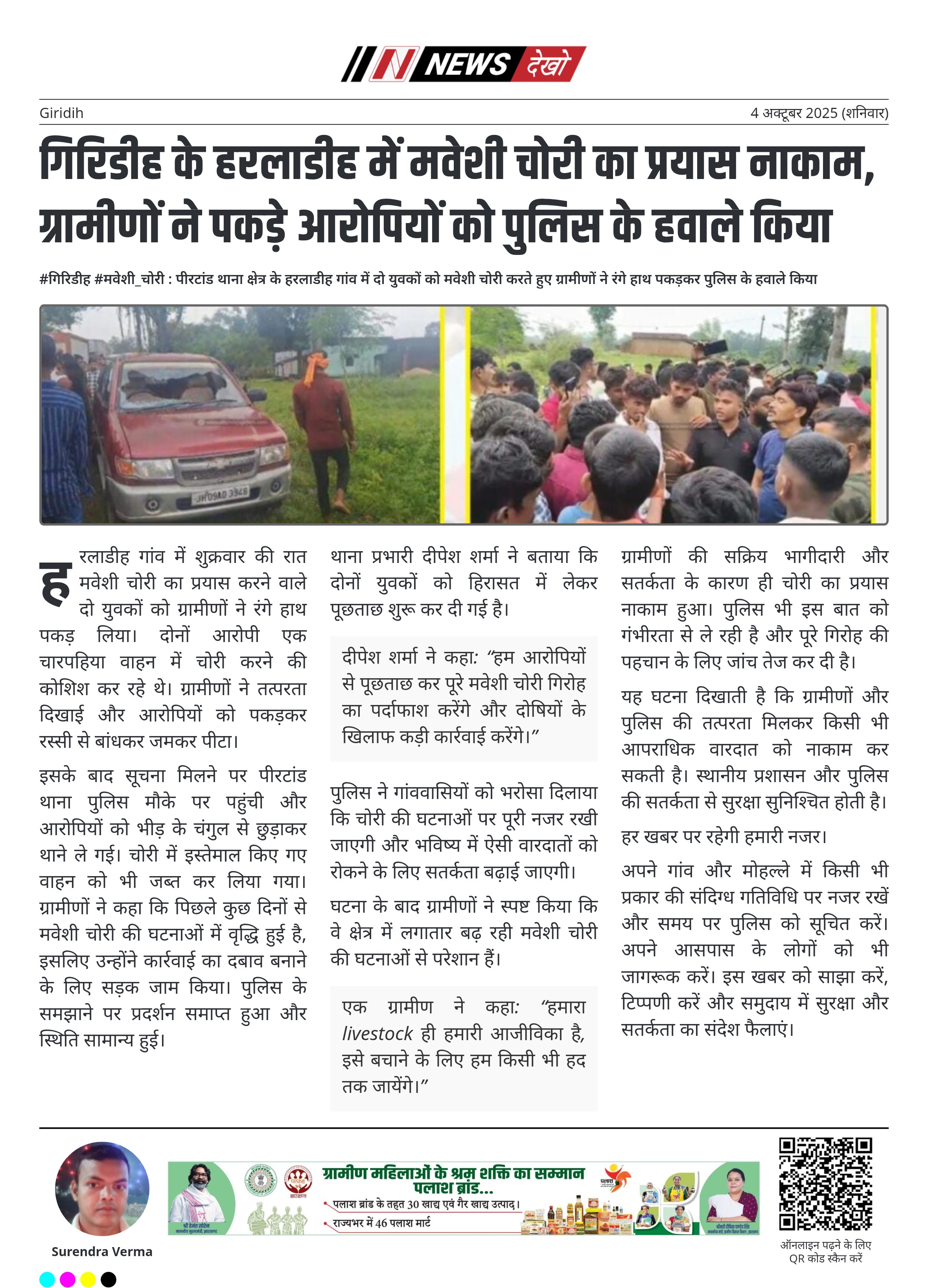 न्यूज़ देखो: गिरिडीह में ग्रामीणों और पुलिस की संयुक्त सतर्कता ने मवेशी चोरी रोकने में सफलता दिलाई