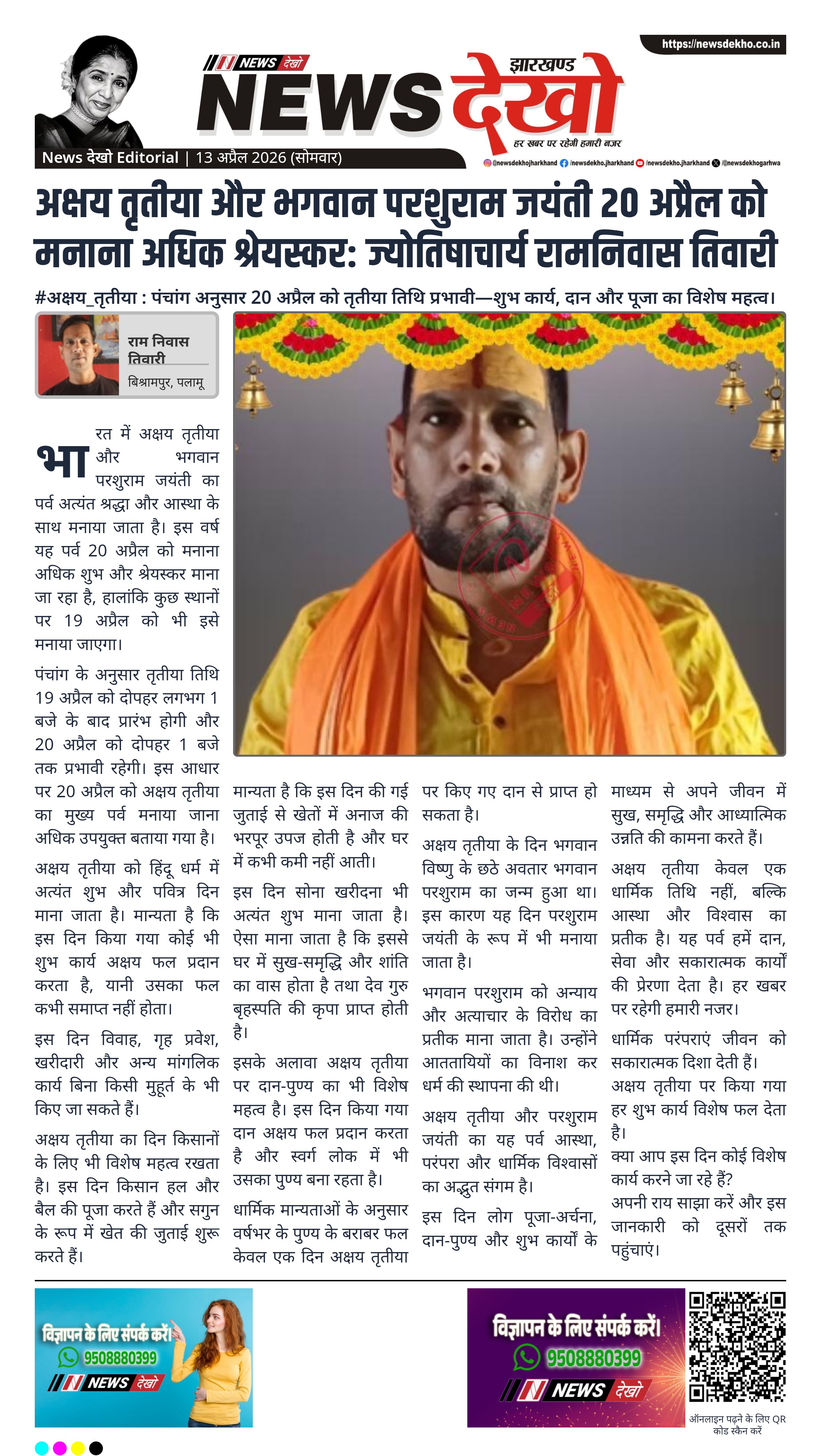 भारत में अक्षय तृतीया और भगवान परशुराम जयंती का पर्व अत्यंत श्रद्धा और आस्था के साथ मनाया जाता है। इस वर्ष यह पर्व 20 अप्रैल को मनाना अधिक शुभ और श्रेयस्कर माना जा रहा है, हालांकि कुछ स्थानों पर 19 अप्रैल को भी इसे मनाया जाएगा।