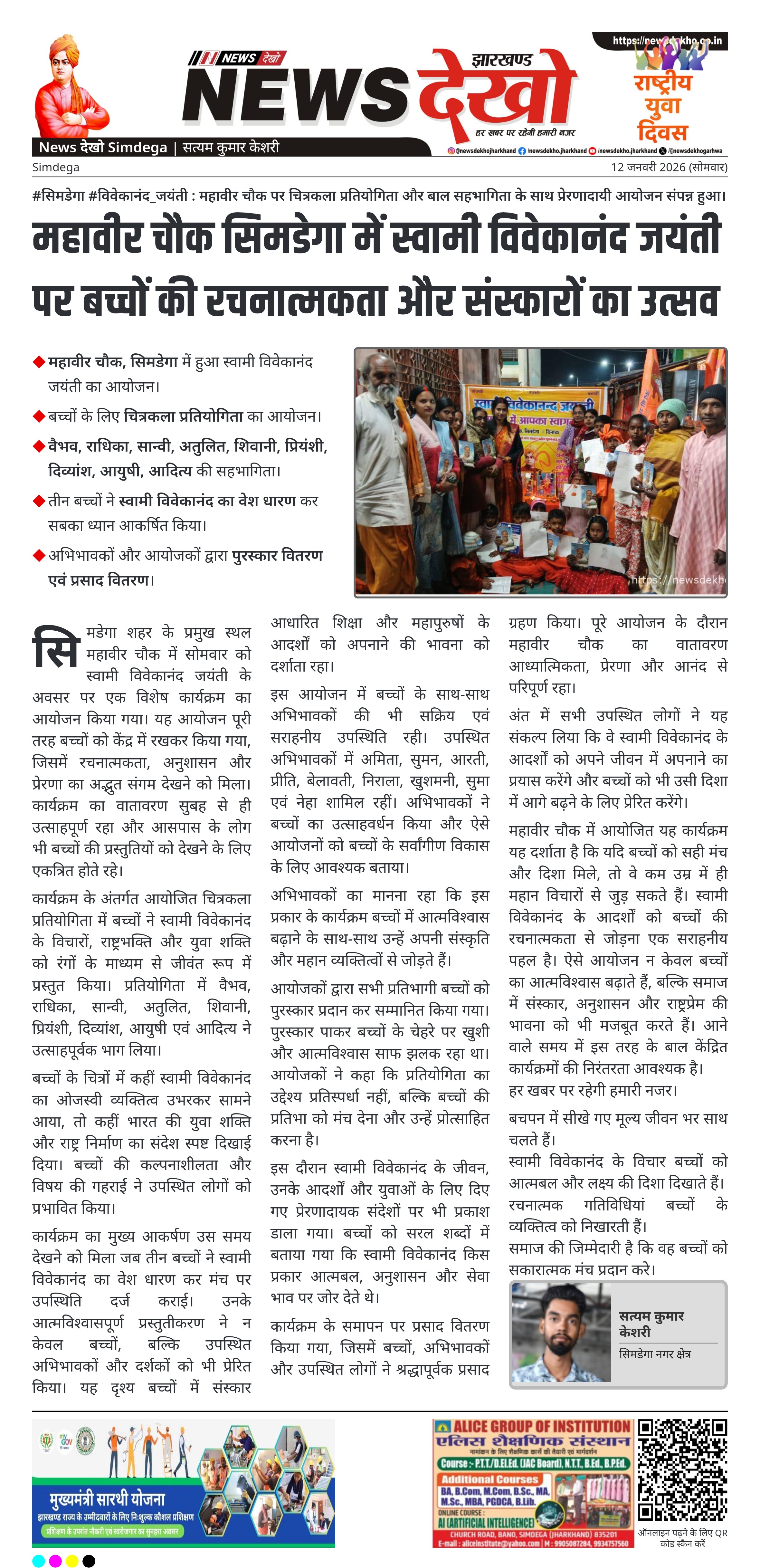 सिमडेगा शहर के महावीर चौक में स्वामी विवेकानंद जयंती के अवसर पर एक बाल केंद्रित और प्रेरणादायी कार्यक्रम का आयोजन किया गया। इस दौरान बच्चों के लिए चित्रकला प्रतियोगिता आयोजित हुई, जिसमें स्वामी विवेकानंद के विचार, राष्ट्रभक्ति और युवा शक्ति को रचनात्मक रूप में प्रस्तुत किया गया। कार्यक्रम में बच्चों के साथ अभिभावकों की सक्रिय भागीदारी रही और सभी प्रतिभागियों को पुरस्कार देकर सम्मानित किया गया। आयोजन का उद्देश्य बच्चों में संस्कार, आत्मविश्वास और राष्ट्रप्रेम की भावना को प्रोत्साहित करना रहा।