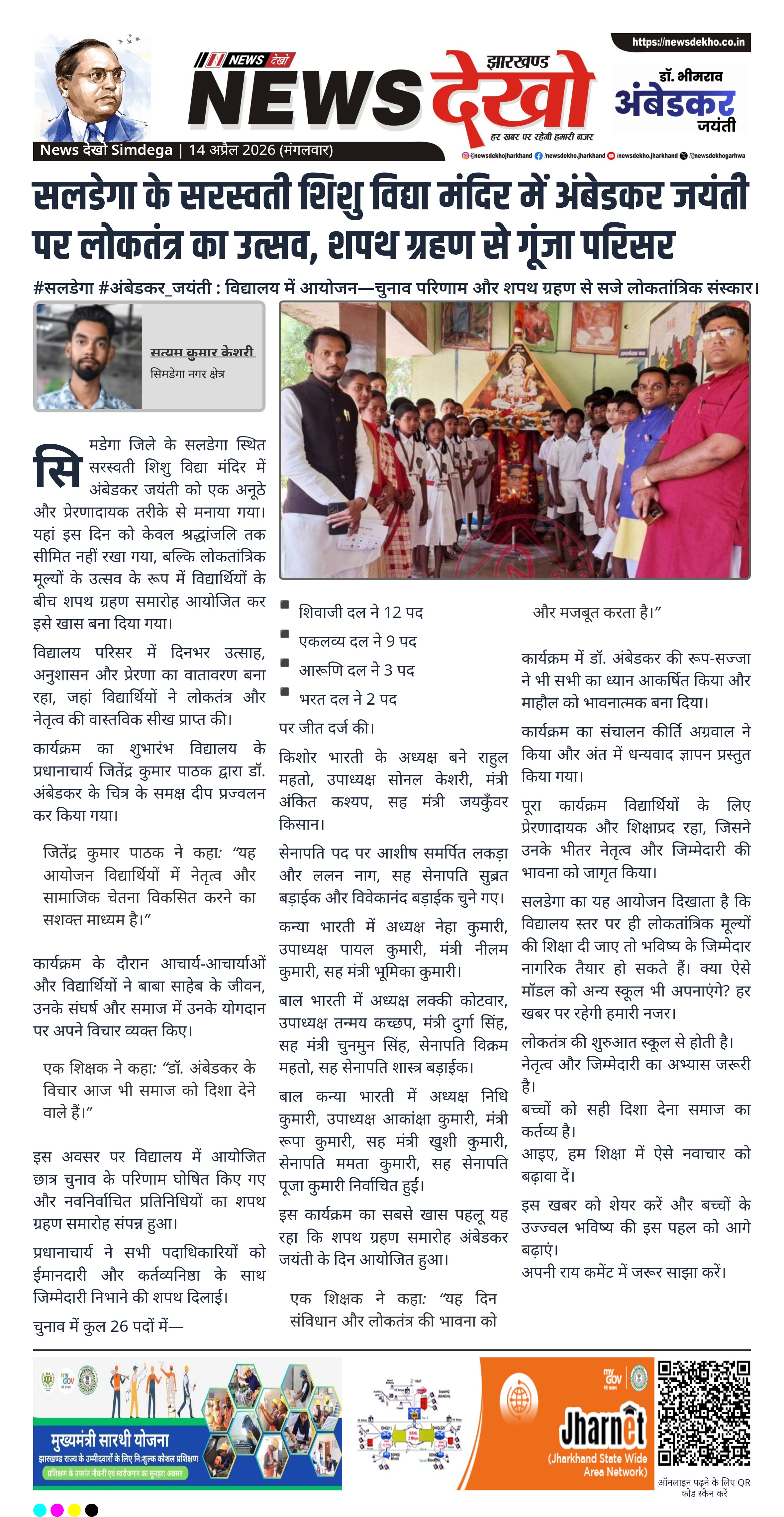 सिमडेगा के सलडेगा स्थित सरस्वती शिशु विद्या मंदिर में अंबेडकर जयंती पर विशेष कार्यक्रम हुआ। विद्यार्थियों के चुनाव परिणाम घोषित कर शपथ ग्रहण कराया गया। शिक्षकों ने लोकतांत्रिक मूल्यों और नेतृत्व क्षमता पर जोर दिया। कार्यक्रम में उत्साह और अनुशासन का माहौल रहा।