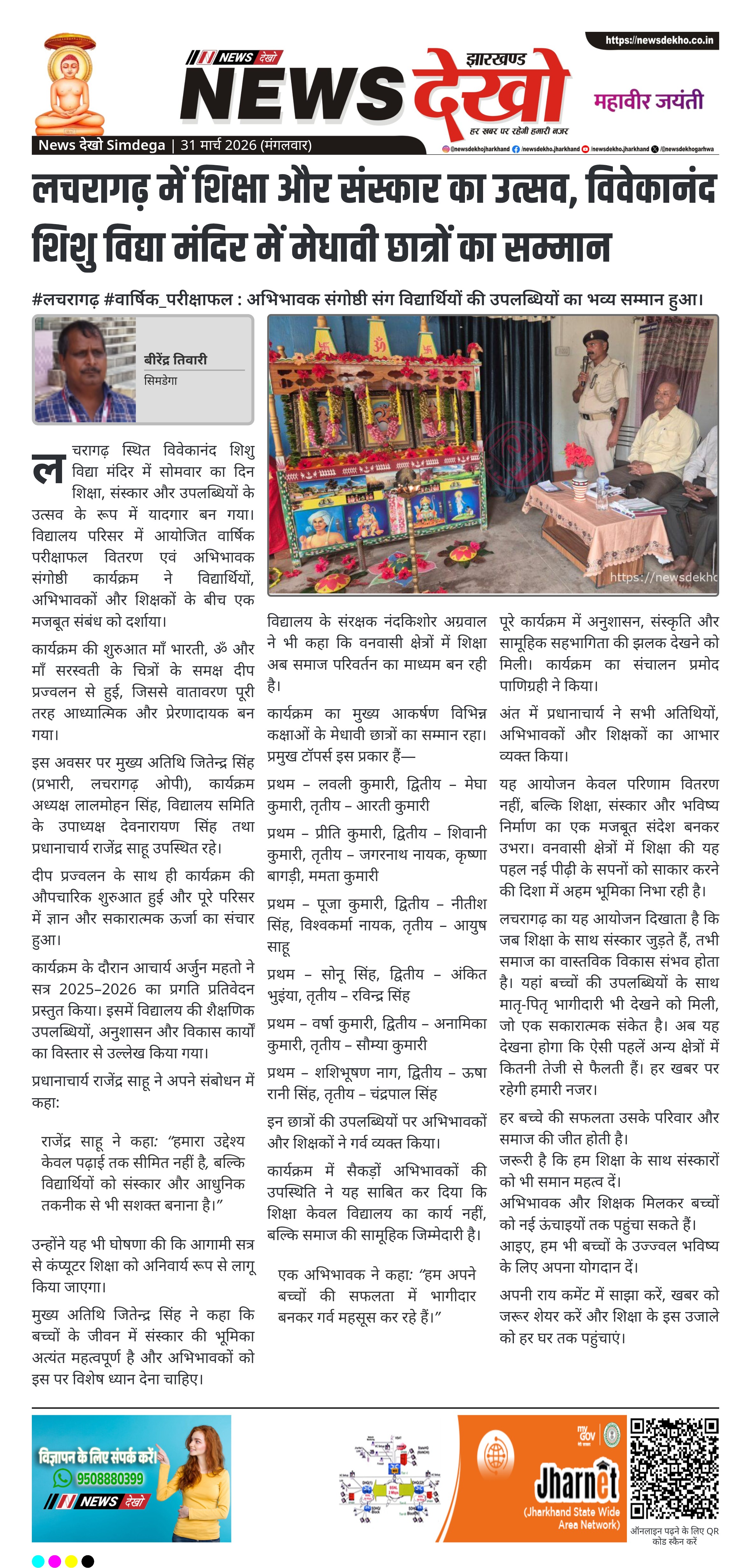 सिमडेगा जिले के लचरागढ़ स्थित विवेकानंद शिशु विद्या मंदिर में वार्षिक परीक्षाफल वितरण और अभिभावक संगोष्ठी का आयोजन किया गया। कार्यक्रम में विद्यार्थियों की शैक्षणिक उपलब्धियों को सराहा गया और अभिभावकों की भागीदारी सुनिश्चित की गई। मुख्य अतिथि जितेन्द्र सिंह समेत कई गणमान्य लोग उपस्थित रहे। आयोजन ने शिक्षा, संस्कार और सामाजिक सहयोग का संदेश दिया।