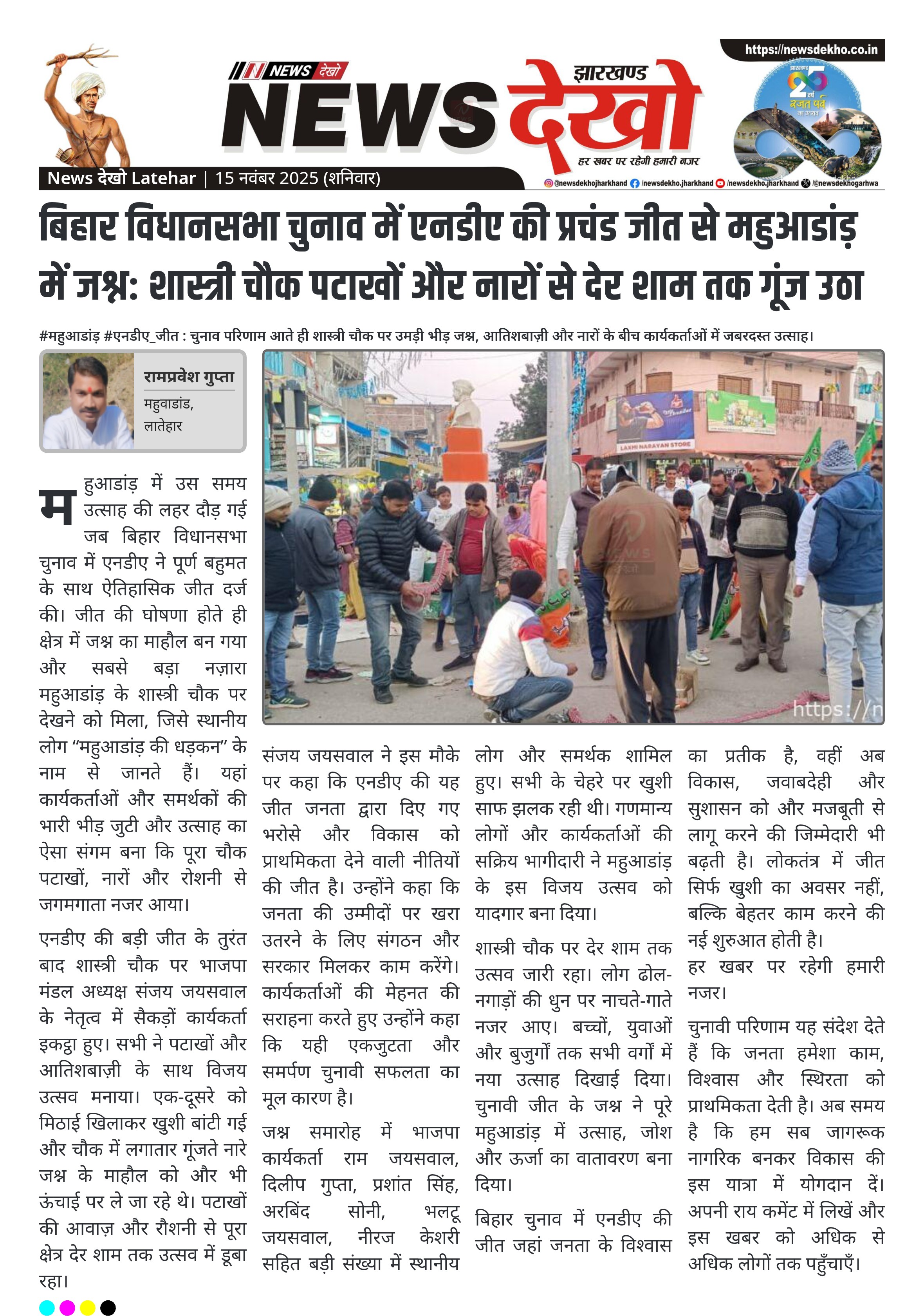एनडीए की बड़ी जीत के तुरंत बाद शास्त्री चौक पर भाजपा मंडल अध्यक्ष संजय जयसवाल के नेतृत्व में सैकड़ों कार्यकर्ता इकट्ठा हुए। सभी ने पटाखों और आतिशबाज़ी के साथ विजय उत्सव मनाया। एक-दूसरे को मिठाई खिलाकर खुशी बांटी गई और चौक में लगातार गूंजते नारे जश्न के माहौल को और भी ऊंचाई पर ले जा रहे थे। पटाखों की आवाज़ और रौशनी से पूरा क्षेत्र देर शाम तक उत्सव में डूबा रहा।