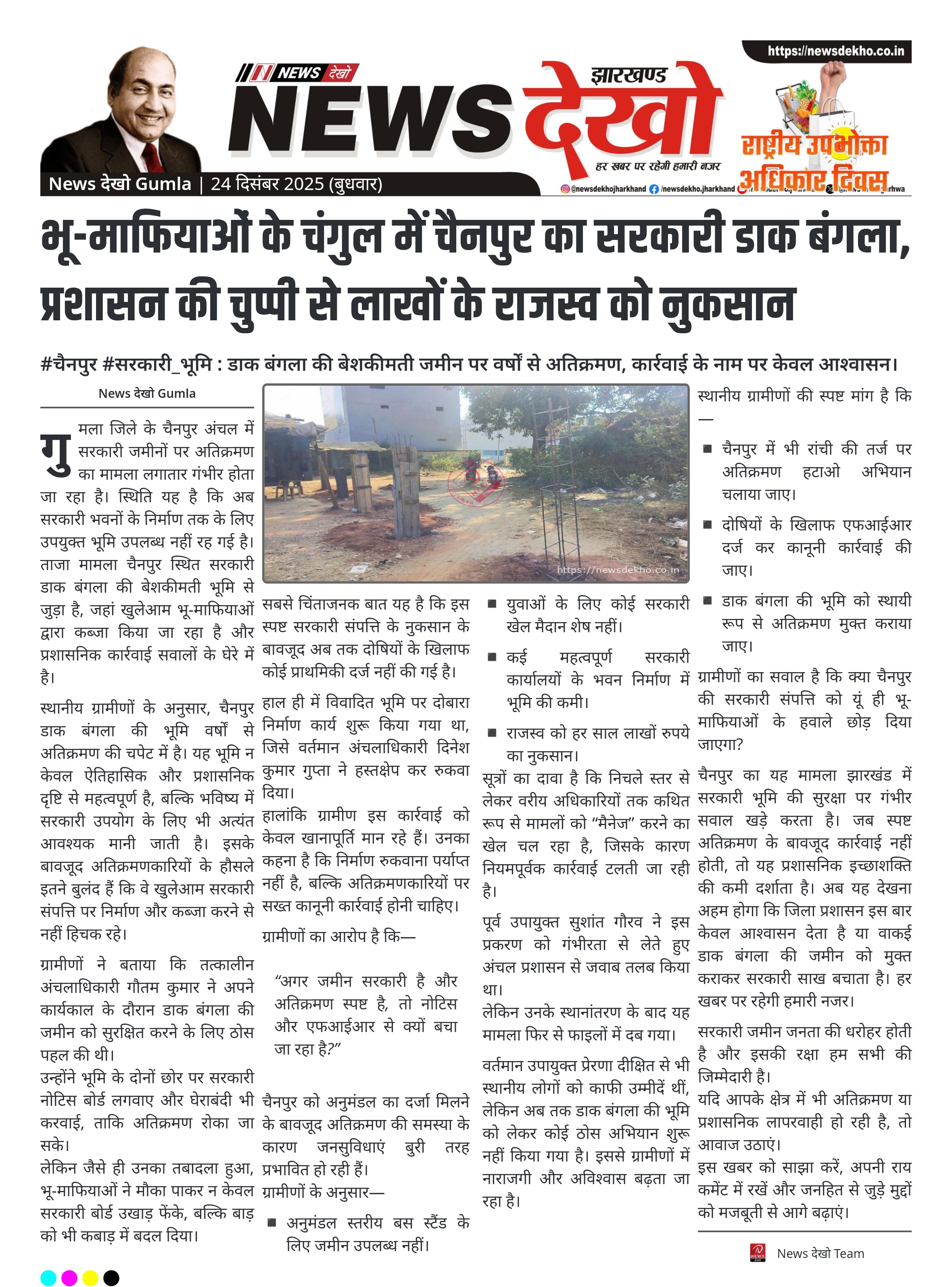 गुमला जिले के चैनपुर अंचल में सरकारी डाक बंगला की बहुमूल्य भूमि पर वर्षों से अतिक्रमण का गंभीर मामला सामने आया है। आरोप है कि भू-माफियाओं ने प्रशासन की निष्क्रियता का लाभ उठाकर सरकारी जमीन पर कब्जा कर लिया है। पूर्व अधिकारियों की पहल के बाद भी वर्तमान में ठोस दंडात्मक कार्रवाई नहीं हो सकी है। यह मामला न केवल सरकारी संपत्ति की सुरक्षा, बल्कि राजस्व और जनहित से जुड़ा अहम सवाल बन गया है।