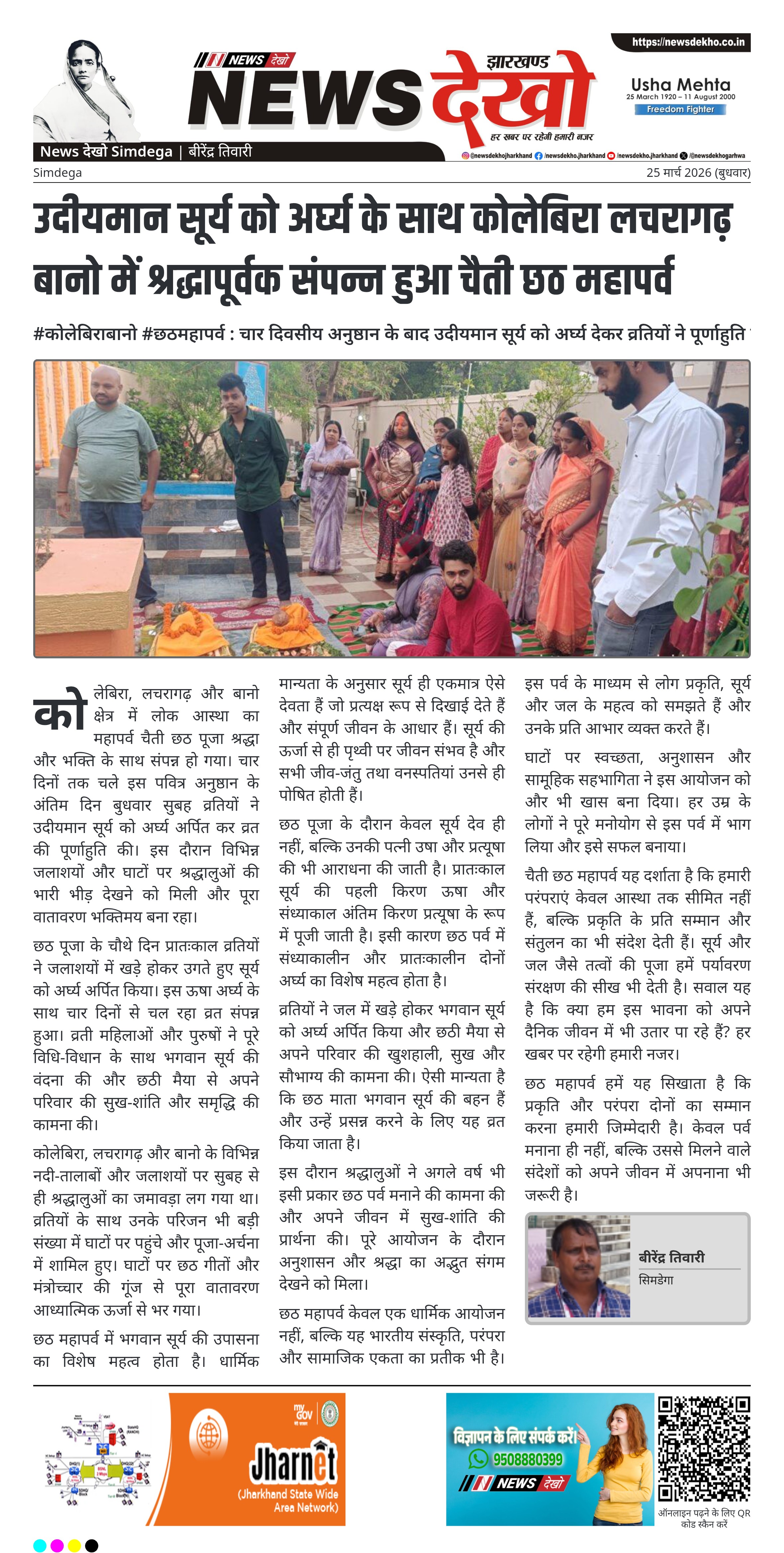 कोलेबिरा, लचरागढ़ और बानो क्षेत्र में चैती छठ महापर्व के अंतिम दिन व्रतियों ने उदीयमान सूर्य को अर्घ्य अर्पित कर व्रत का समापन किया। चार दिनों तक चले इस पर्व में विभिन्न घाटों पर श्रद्धालुओं की भारी भीड़ उमड़ी। बुधवार सुबह ऊषा अर्घ्य के साथ पूजा पूर्ण हुई और व्रतियों ने छठी मैया से सुख-समृद्धि की कामना की। पूरे क्षेत्र में भक्ति और आस्था का वातावरण बना रहा।