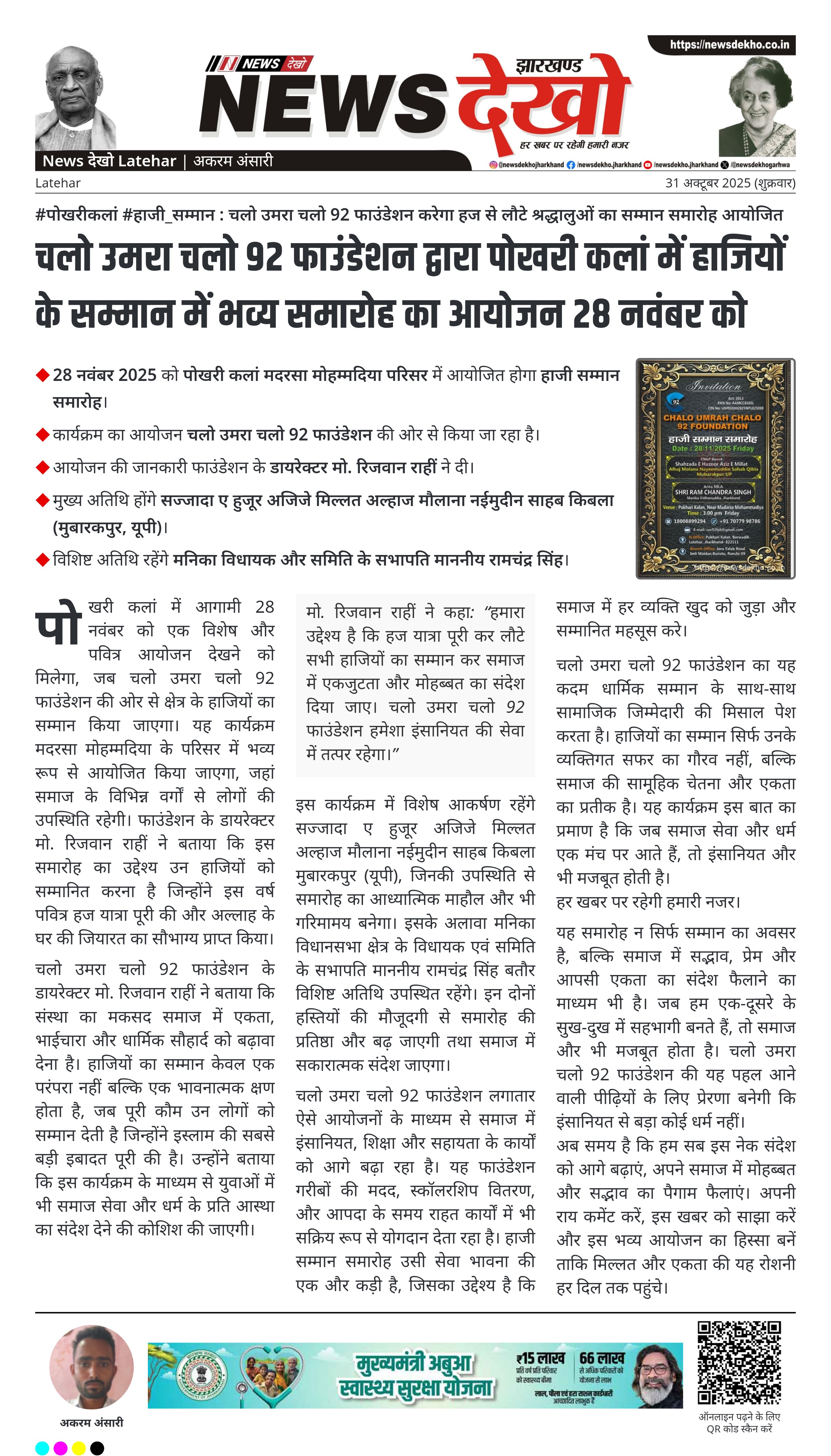 चलो उमरा चलो 92 फाउंडेशन लगातार ऐसे आयोजनों के माध्यम से समाज में इंसानियत, शिक्षा और सहायता के कार्यों को आगे बढ़ा रहा है। यह फाउंडेशन गरीबों की मदद, स्कॉलरशिप वितरण, और आपदा के समय राहत कार्यों में भी सक्रिय रूप से योगदान देता रहा है। हाजी सम्मान समारोह उसी सेवा भावना की एक और कड़ी है, जिसका उद्देश्य है कि समाज में हर व्यक्ति खुद को जुड़ा और सम्मानित महसूस करे।