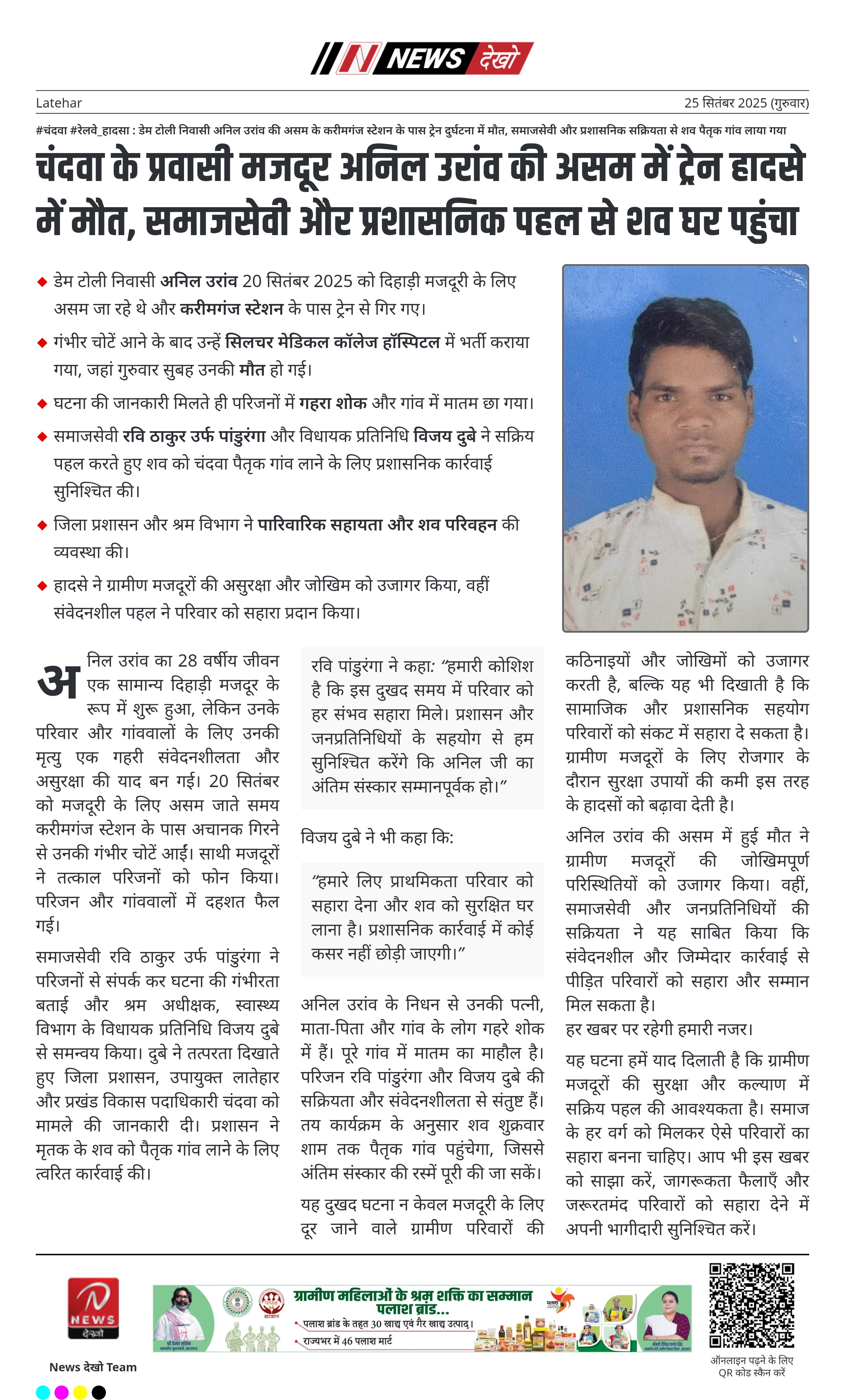 - डेम टोली निवासी अनिल उरांव 20 सितंबर 2025 को दिहाड़ी मजदूरी के लिए असम जा रहे थे और करीमगंज स्टेशन के पास ट्रेन से गिर गए।