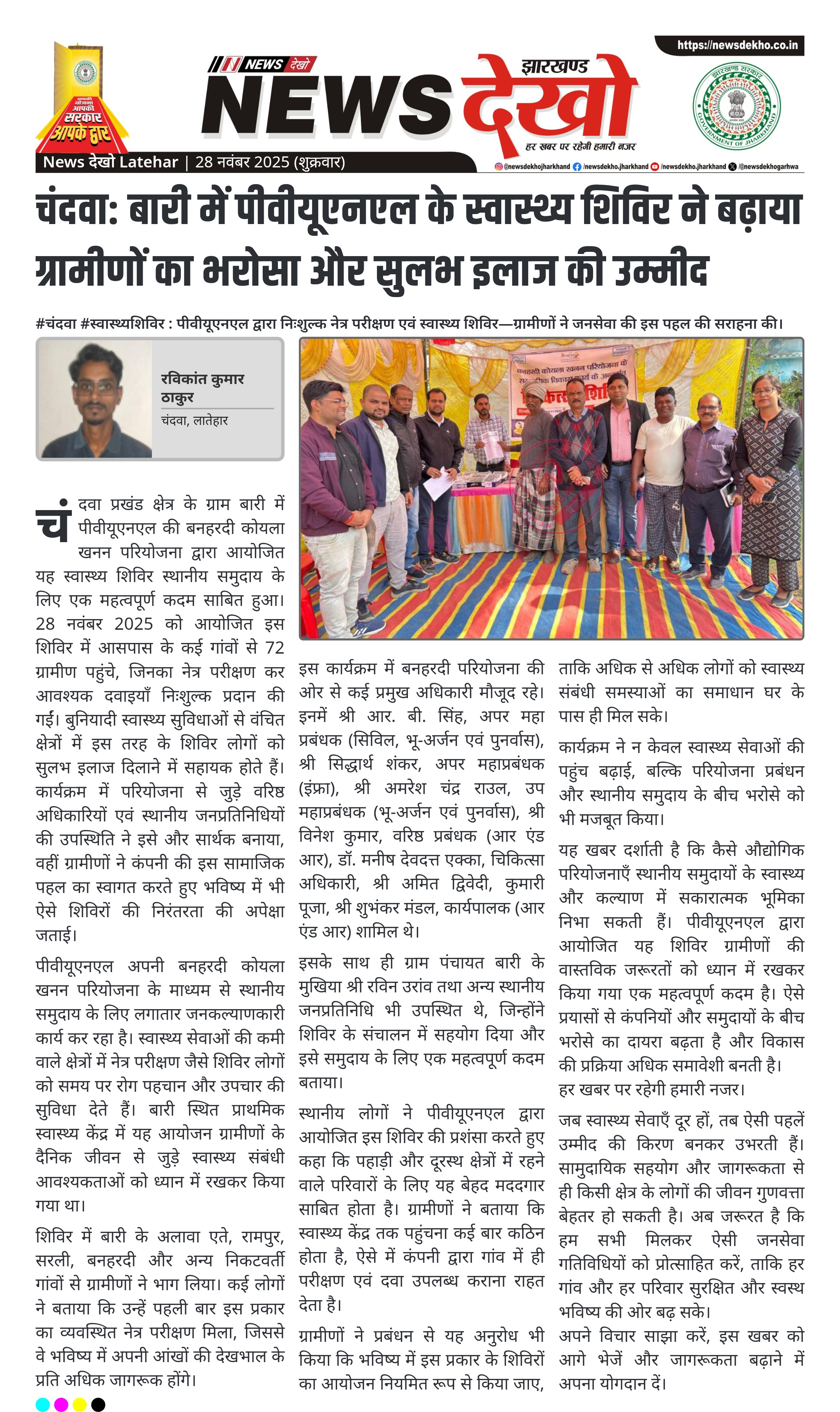 पीवीयूएनएल अपनी बनहरदी कोयला खनन परियोजना के माध्यम से स्थानीय समुदाय के लिए लगातार जनकल्याणकारी कार्य कर रहा है। स्वास्थ्य सेवाओं की कमी वाले क्षेत्रों में नेत्र परीक्षण जैसे शिविर लोगों को समय पर रोग पहचान और उपचार की सुविधा देते हैं। बारी स्थित प्राथमिक स्वास्थ्य केंद्र में यह आयोजन ग्रामीणों के दैनिक जीवन से जुड़े स्वास्थ्य संबंधी आवश्यकताओं को ध्यान में रखकर किया गया था।