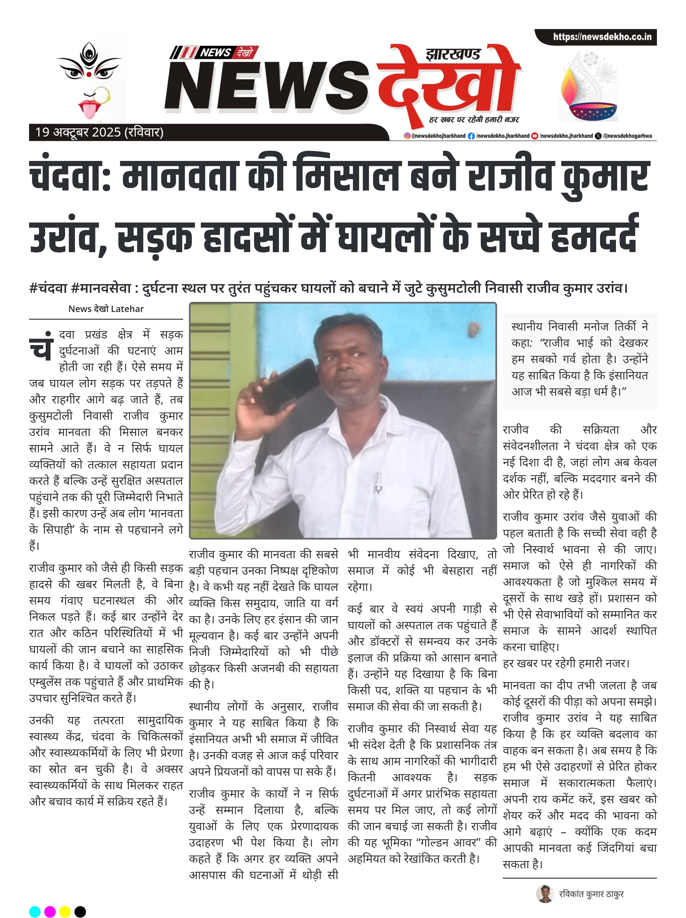 - कुसुमटोली निवासी राजीव कुमार उरांव ने मानवता का परिचय देते हुए कई घायलों की जान बचाई।
