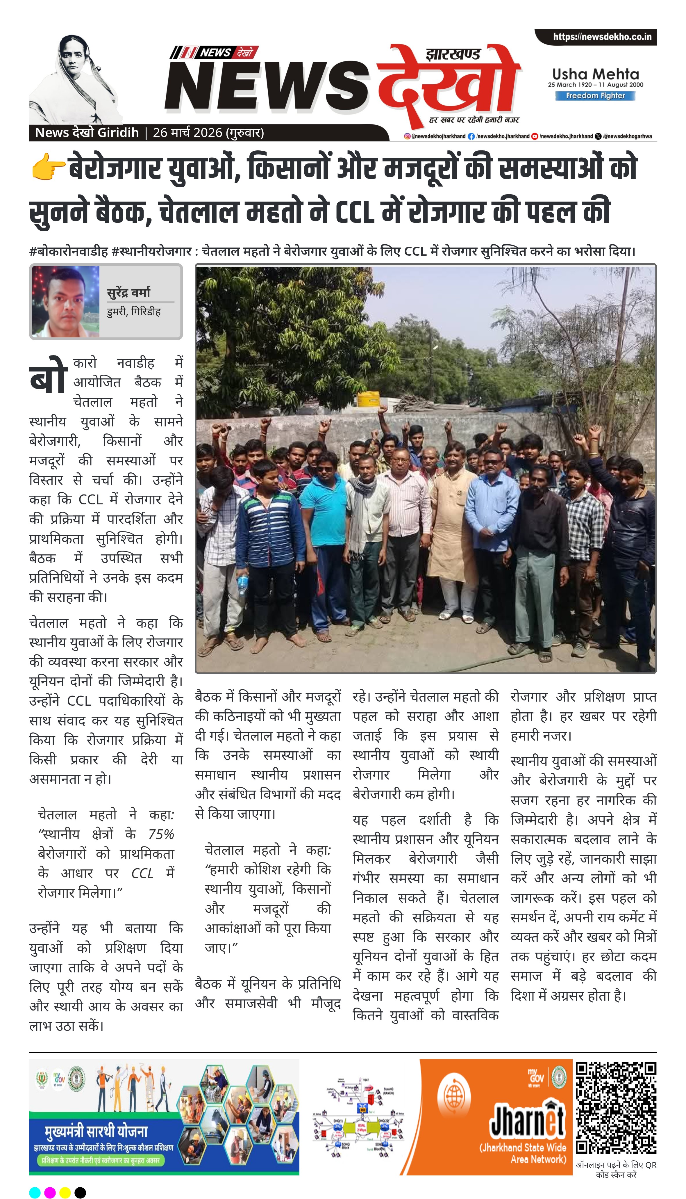 рдЭрд╛рд░рдЦрдВрдб рдПрдХрддрд╛ рдХрд┐рд╕рд╛рди рдордЬрджреВрд░ рдпреВрдирд┐рдпрди рдХреЗ рдХреЗрдВрджреНрд░реАрдп рд╕рдВрд░рдХреНрд╖рдХ рдФрд░ рдкреВрд░реНрд╡ рдКрд░реНрдЬрд╛ рдордВрддреНрд░реА рдХреЗ рдЫреЛрдЯреЗ рднрд╛рдИ рдЪреЗрддрд▓рд╛рд▓ рдорд╣рддреЛ рдиреЗ рдмреЛрдХрд╛рд░реЛ рдирд╡рд╛рдбреАрд╣ рдореЗрдВ рд╕реНрдерд╛рдиреАрдп рдмреЗрд░реЛрдЬрдЧрд╛рд░ рдпреБрд╡рд╛рдУрдВ, рдХрд┐рд╕рд╛рдиреЛрдВ рдФрд░ рдордЬрджреВрд░реЛрдВ рдХреА рд╕рдорд╕реНрдпрд╛рдУрдВ рдХреЛ рд╕реБрдирдиреЗ рдФрд░ рд╕рдорд╛рдзрд╛рди рдирд┐рдХрд╛рд▓рдиреЗ рдХреЗ рд▓рд┐рдП рдмреИрдардХ рдХреАред рдЙрдиреНрд╣реЛрдВрдиреЗ рдЭрд╛рд░рдЦрдВрдб рд╕рд░рдХрд╛рд░ рдХреЗ рдирд┐рд░реНрджреЗрд╢рд╛рдиреБрд╕рд╛рд░ CCL рдореЗрдВ рд╕реНрдерд╛рдиреАрдп рдпреБрд╡рд╛рдУрдВ рдХреЗ рд▓рд┐рдП рд░реЛрдЬрдЧрд╛рд░ рдХреА рд╕реБрд╡рд┐рдзрд╛ рджреЗрдиреЗ рдХрд╛ рдЖрд╢реНрд╡рд╛рд╕рди рджрд┐рдпрд╛ред рдмреИрдардХ рдореЗрдВ рд╕реНрдерд╛рдиреАрдп рдкрджрд╛рдзрд┐рдХрд╛рд░рд┐рдпреЛрдВ рдФрд░ рд╕рдорд╛рдЬрд╕реЗрд╡рд┐рдпреЛрдВ рдиреЗ рднреА рднрд╛рдЧ рд▓рд┐рдпрд╛ред рдпрд╣ рдкрд╣рд▓ рдмреЗрд░реЛрдЬрдЧрд╛рд░ рдпреБрд╡рд╛рдУрдВ рдХреЛ рд╕реНрдерд╛рдпреА рд░реЛрдЬрдЧрд╛рд░ рдФрд░ рдЖрд░реНрдерд┐рдХ рд╕реБрд░рдХреНрд╖рд╛ рджреЗрдиреЗ рдХреЗ рд▓рд┐рдП рдорд╣рддреНрд╡рдкреВрд░реНрдг рд╣реИред