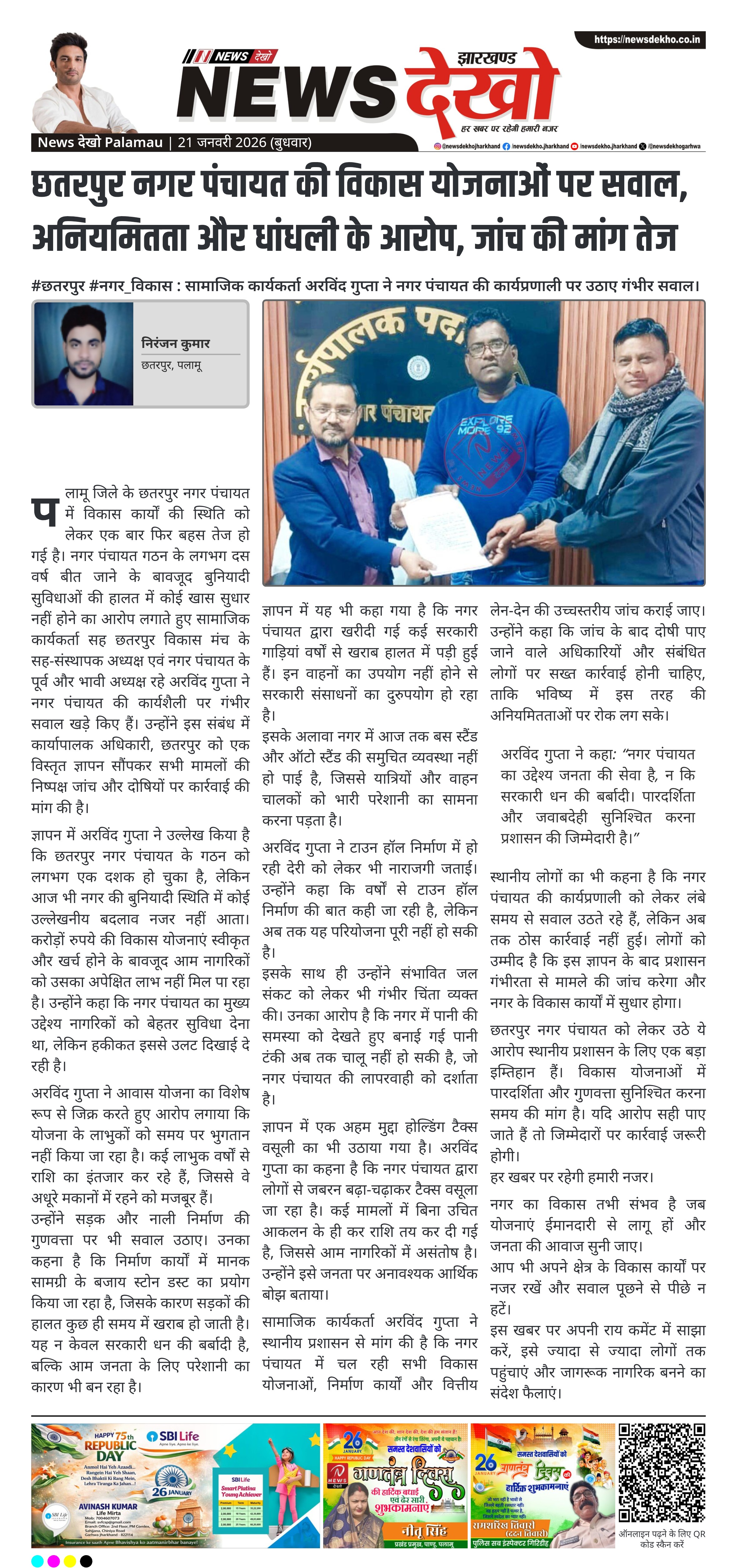पलामू जिले के छतरपुर नगर पंचायत में विकास कार्यों की स्थिति को लेकर एक बार फिर बहस तेज हो गई है। नगर पंचायत गठन के लगभग दस वर्ष बीत जाने के बावजूद बुनियादी सुविधाओं की हालत में कोई खास सुधार नहीं होने का आरोप लगाते हुए सामाजिक कार्यकर्ता सह छतरपुर विकास मंच के सह-संस्थापक अध्यक्ष एवं नगर पंचायत के पूर्व और भावी अध्यक्ष रहे अरविंद गुप्ता ने नगर पंचायत की कार्यशैली पर गंभीर सवाल खड़े किए हैं। उन्होंने इस संबंध में कार्यापालक अधिकारी, छतरपुर को एक विस्तृत ज्ञापन सौंपकर सभी मामलों की निष्पक्ष जांच और दोषियों पर कार्रवाई की मांग की है।