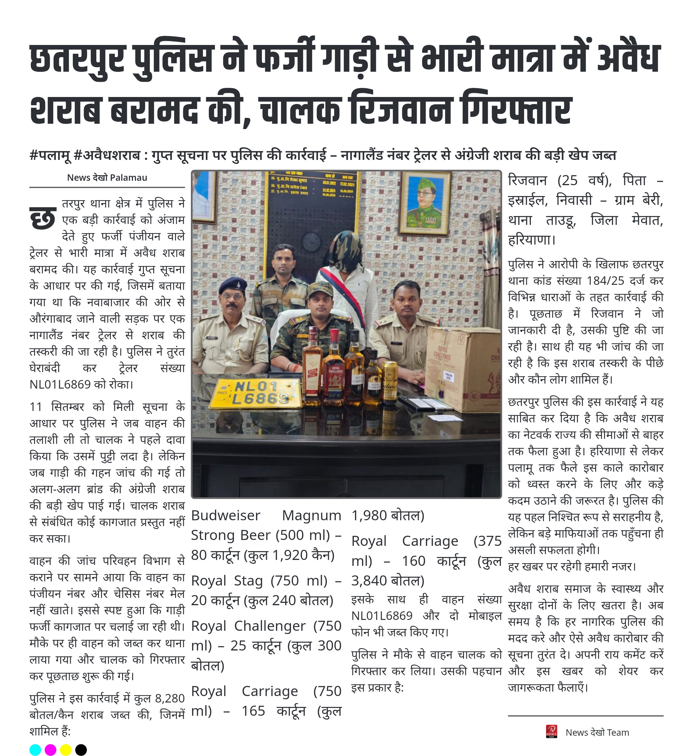 • छतरपुर थाना पुलिस ने नागालैंड नंबर ट्रेलर से भारी मात्रा में अवैध अंग्रेजी शराब पकड़ी।