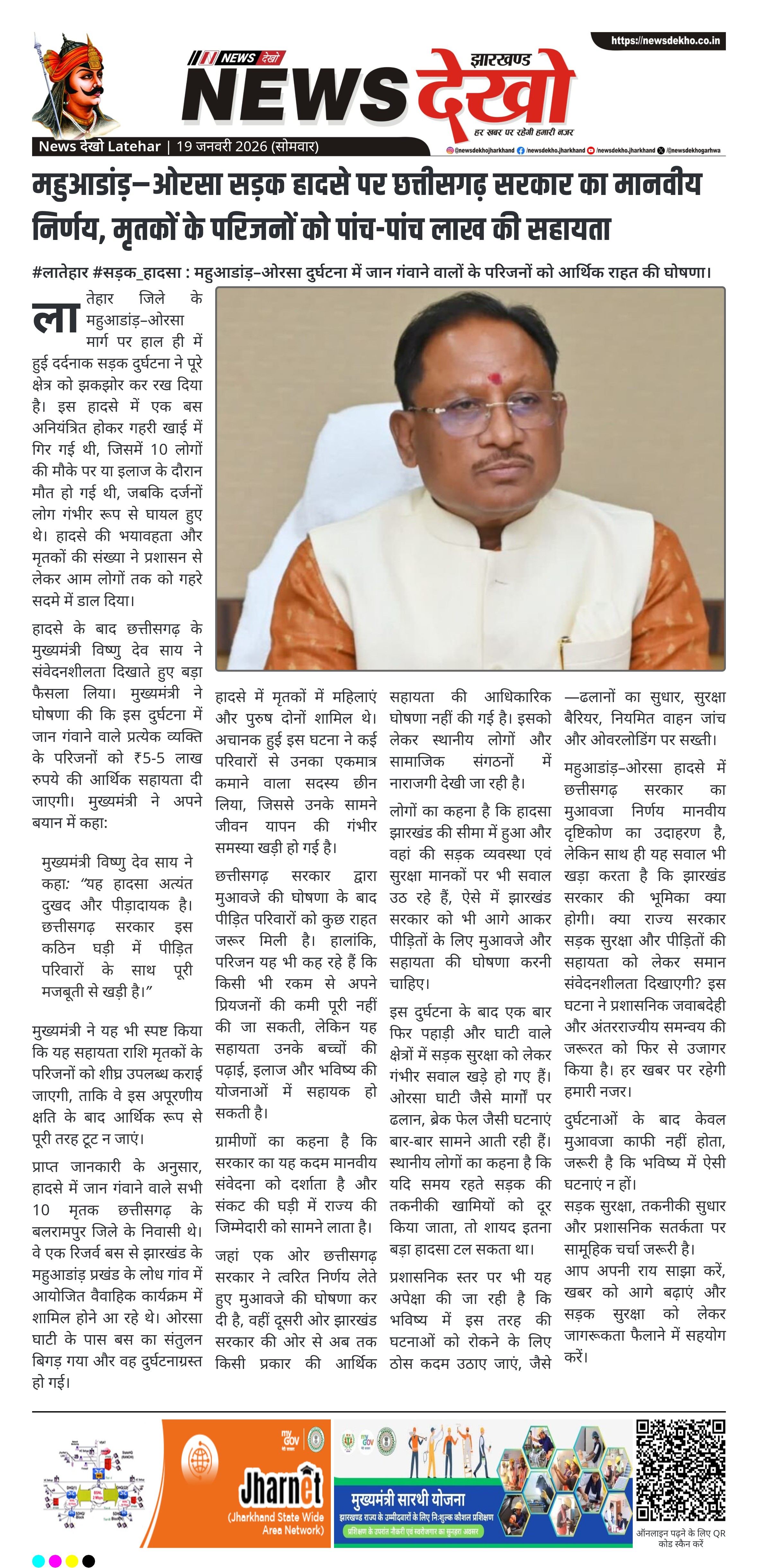 लातेहार जिले के महुआडांड़–ओरसा सड़क पर हुए भीषण हादसे में 10 लोगों की मौत के बाद छत्तीसगढ़ सरकार ने बड़ा मानवीय फैसला लिया है। मुख्यमंत्री विष्णु देव साय ने प्रत्येक मृतक के परिजनों को पांच-पांच लाख रुपये की आर्थिक सहायता देने की घोषणा की है। सभी मृतक छत्तीसगढ़ के निवासी थे, जो एक वैवाहिक कार्यक्रम में शामिल होने जा रहे थे। इस फैसले से शोकाकुल परिवारों को कुछ राहत मिलने की उम्मीद जगी है।
