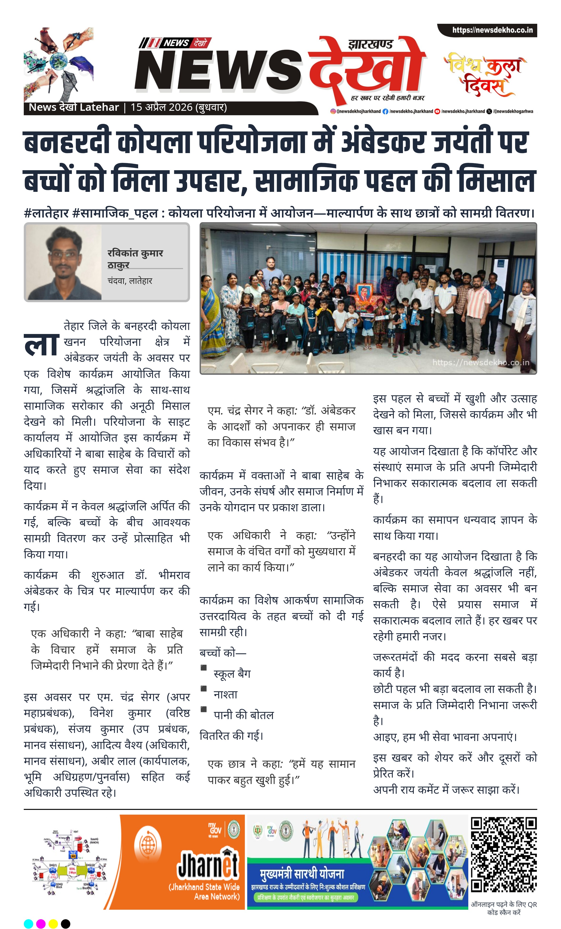 लातेहार जिले के बनहरदी कोयला खनन परियोजना क्षेत्र में अंबेडकर जयंती के अवसर पर एक विशेष कार्यक्रम आयोजित किया गया, जिसमें श्रद्धांजलि के साथ-साथ सामाजिक सरोकार की अनूठी मिसाल देखने को मिली। परियोजना के साइट कार्यालय में आयोजित इस कार्यक्रम में अधिकारियों ने बाबा साहेब के विचारों को याद करते हुए समाज सेवा का संदेश दिया।
