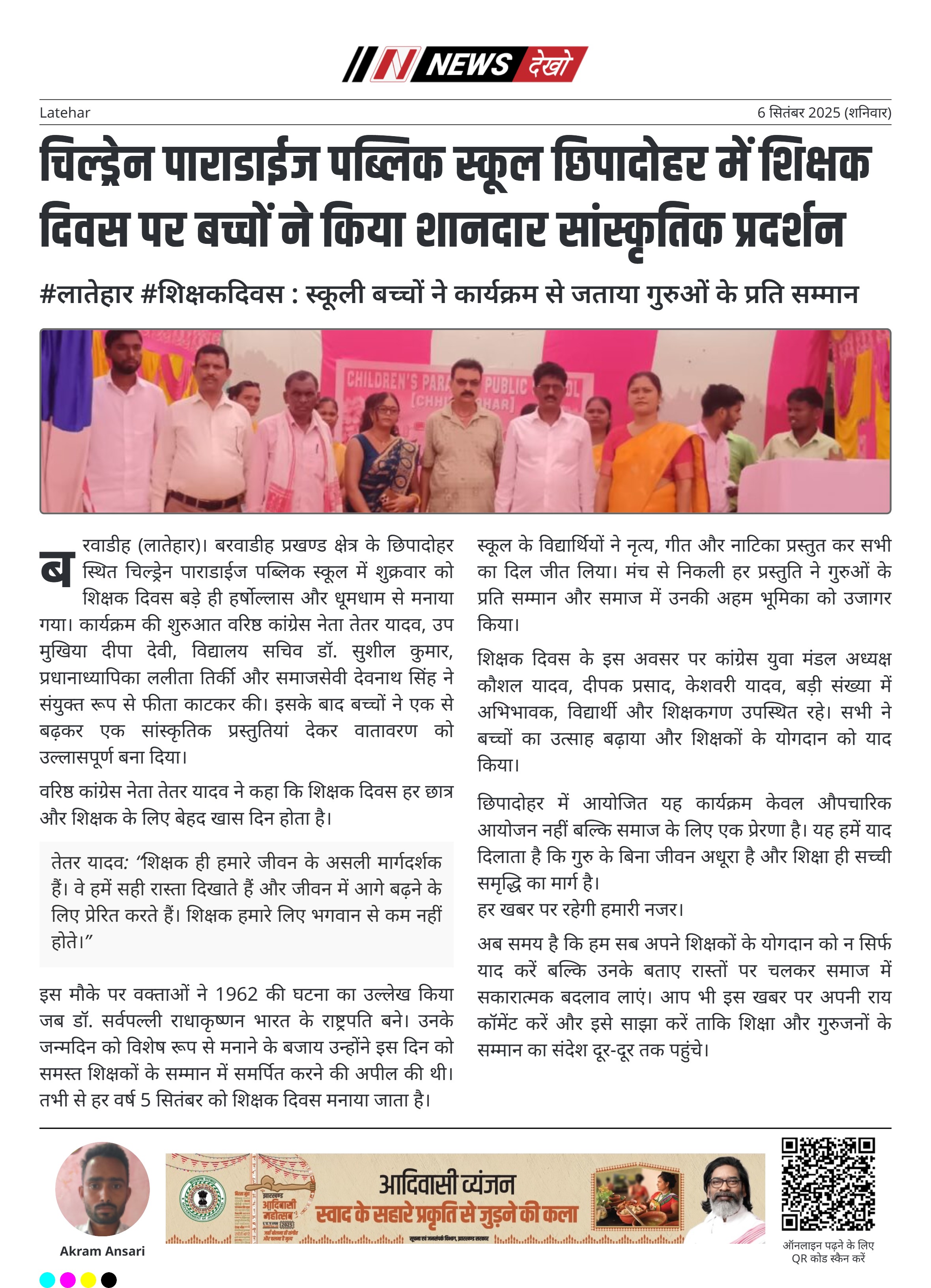 बरवाडीह (लातेहार)। बरवाडीह प्रखण्ड क्षेत्र के छिपादोहर स्थित चिल्ड्रेन पाराडाईज पब्लिक स्कूल में शुक्रवार को शिक्षक दिवस बड़े ही हर्षोल्लास और धूमधाम से मनाया गया। कार्यक्रम की शुरुआत वरिष्ठ कांग्रेस नेता तेतर यादव, उप मुखिया दीपा देवी, विद्यालय सचिव डॉ. सुशील कुमार, प्रधानाध्यापिका ललीता तिर्की और समाजसेवी देवनाथ सिंह ने संयुक्त रूप से फीता काटकर की। इसके बाद बच्चों ने एक से बढ़कर एक सांस्कृतिक प्रस्तुतियां देकर वातावरण को उल्लासपूर्ण बना दिया।
