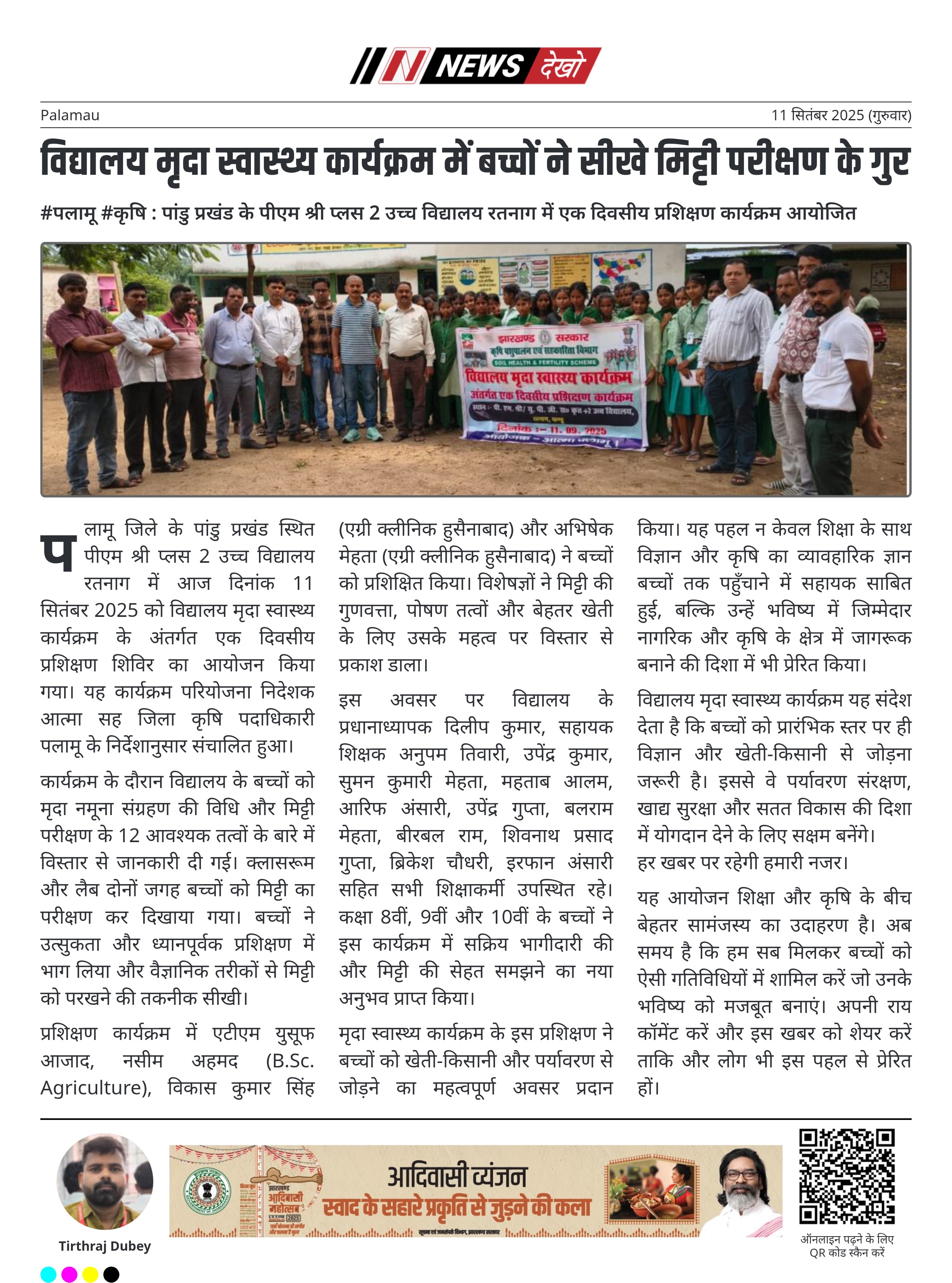 पलामू जिले के पांडु प्रखंड स्थित पीएम श्री प्लस 2 उच्च विद्यालय रतनाग में आज दिनांक 11 सितंबर 2025 को विद्यालय मृदा स्वास्थ्य कार्यक्रम के अंतर्गत एक दिवसीय प्रशिक्षण शिविर का आयोजन किया गया। यह कार्यक्रम परियोजना निदेशक आत्मा सह जिला कृषि पदाधिकारी पलामू के निर्देशानुसार संचालित हुआ।