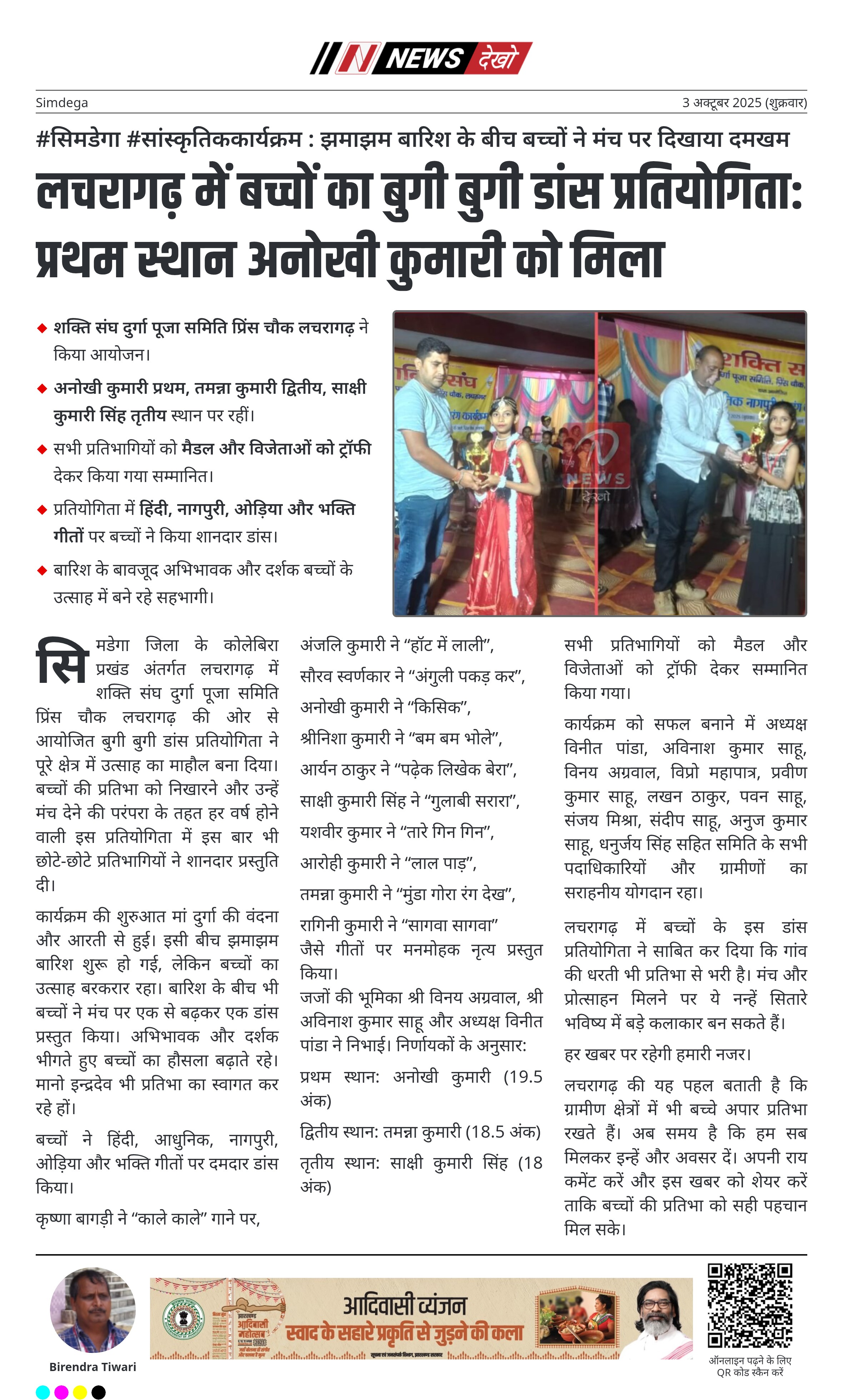 सिमडेगा जिला के कोलेबिरा प्रखंड अंतर्गत लचरागढ़ में शक्ति संघ दुर्गा पूजा समिति प्रिंस चौक लचरागढ़ की ओर से आयोजित बुगी बुगी डांस प्रतियोगिता ने पूरे क्षेत्र में उत्साह का माहौल बना दिया। बच्चों की प्रतिभा को निखारने और उन्हें मंच देने की परंपरा के तहत हर वर्ष होने वाली इस प्रतियोगिता में इस बार भी छोटे-छोटे प्रतिभागियों ने शानदार प्रस्तुति दी।
