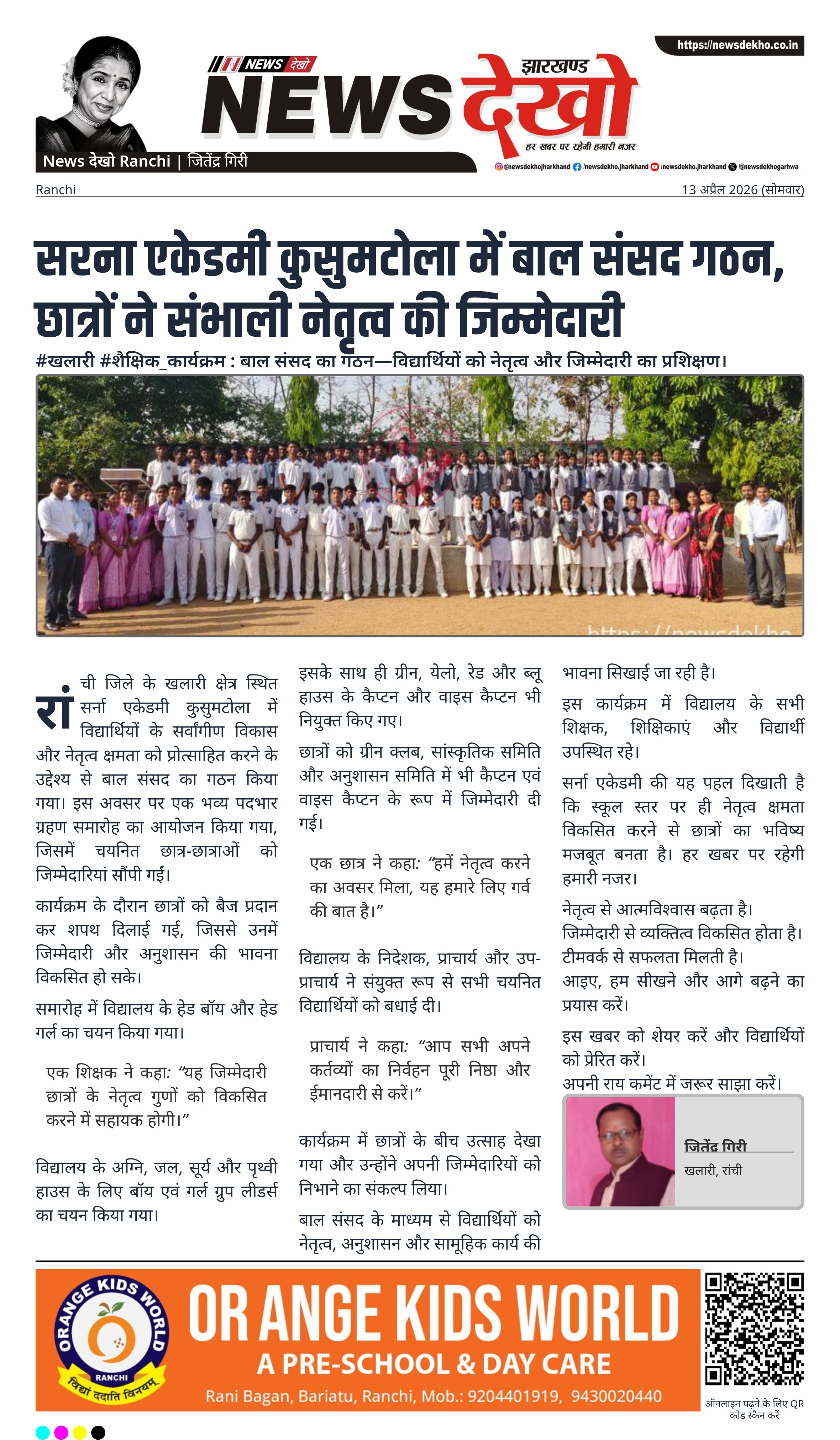रांची जिले के खलारी क्षेत्र स्थित सर्ना एकेडमी कुसुमटोला में विद्यार्थियों के सर्वांगीण विकास और नेतृत्व क्षमता को प्रोत्साहित करने के उद्देश्य से बाल संसद का गठन किया गया। इस अवसर पर एक भव्य पदभार ग्रहण समारोह का आयोजन किया गया, जिसमें चयनित छात्र-छात्राओं को जिम्मेदारियां सौंपी गईं।