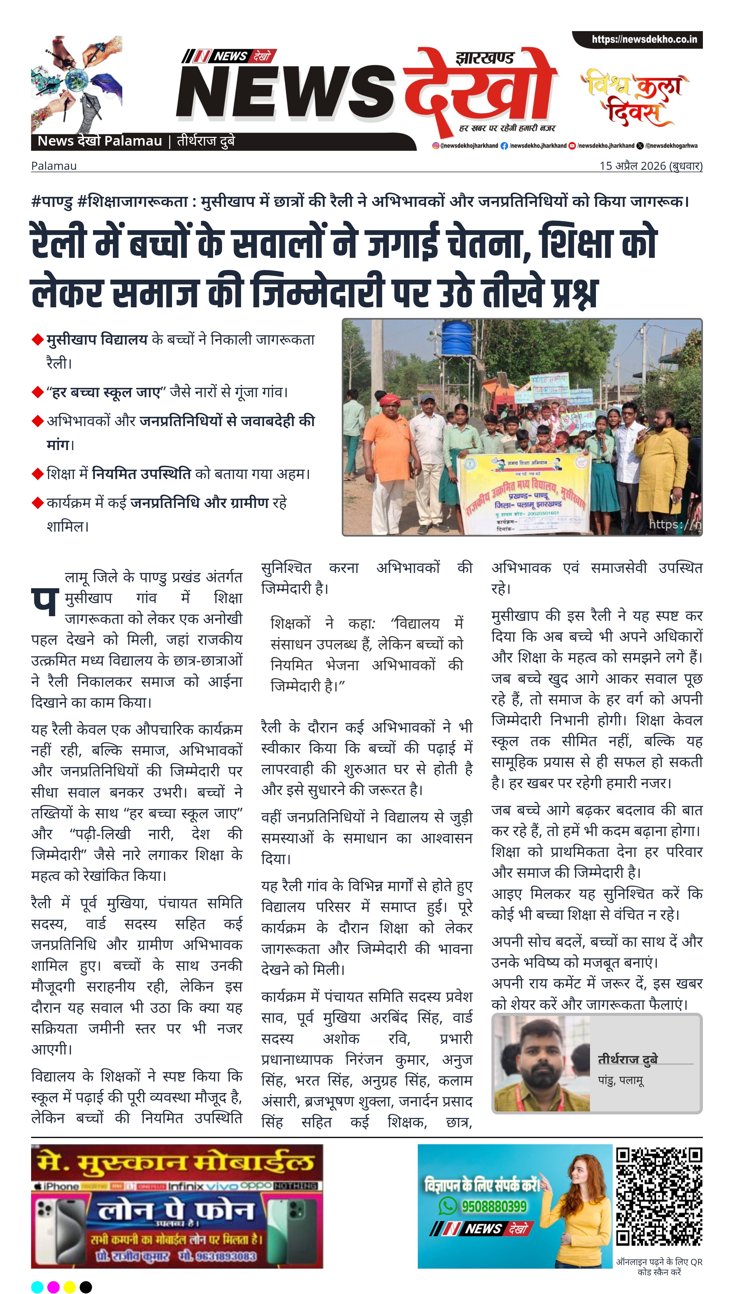 पलामू जिले के पाण्डु प्रखंड के मुसीखाप गांव में राजकीय उत्क्रमित मध्य विद्यालय के छात्रों ने शिक्षा जागरूकता रैली निकाली। इस दौरान बच्चों ने शिक्षा के महत्व को लेकर समाज और अभिभावकों से जिम्मेदारी निभाने की अपील की। रैली ने शिक्षा व्यवस्था और सामाजिक भागीदारी पर गंभीर सवाल खड़े किए।