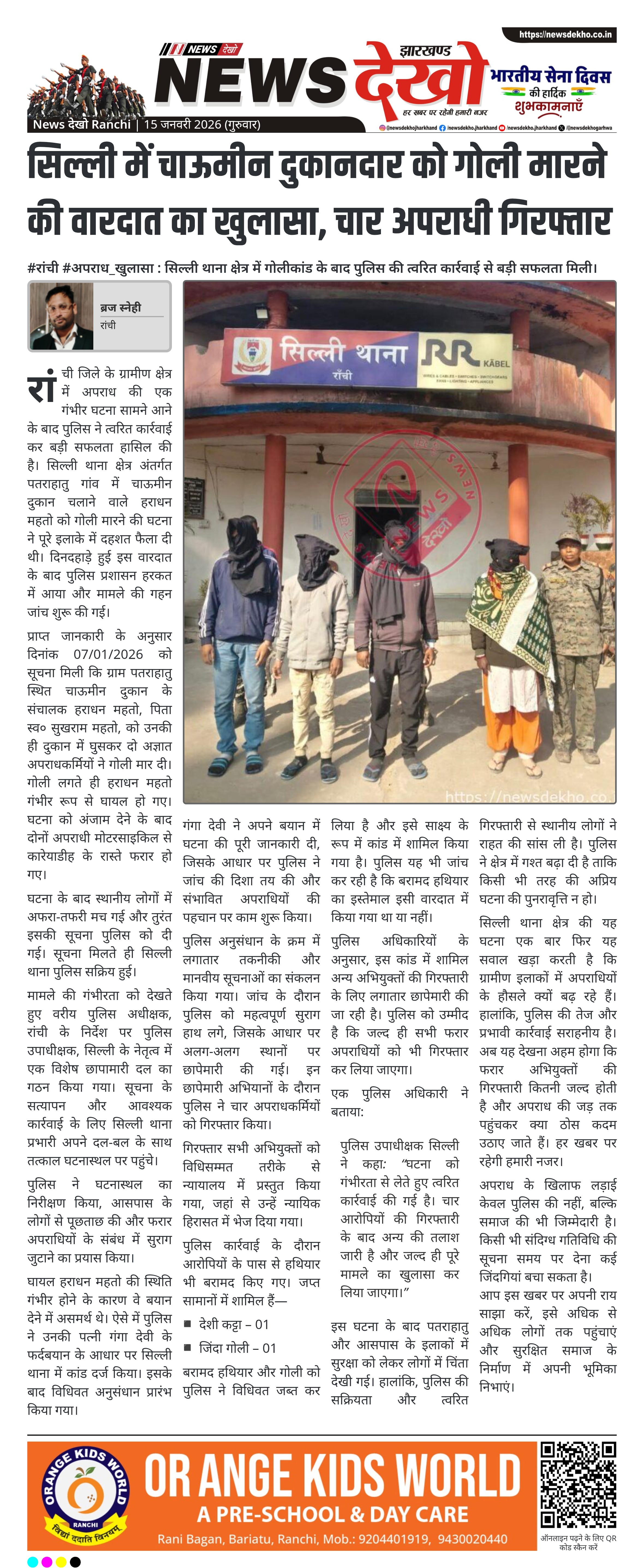 रांची जिले के सिल्ली थाना क्षेत्र अंतर्गत पतराहातु गांव में चाऊमीन दुकान संचालक को गोली मारने की सनसनीखेज घटना का पुलिस ने खुलासा कर दिया है। 7 जनवरी 2026 को हुई इस वारदात के बाद पुलिस ने गंभीरता से जांच करते हुए चार अपराधकर्मियों को गिरफ्तार किया है। घटना में घायल दुकानदार के बयान देने में असमर्थ रहने पर उनकी पत्नी के फर्दबयान के आधार पर मामला दर्ज किया गया। पुलिस ने हथियार और जिंदा गोली बरामद कर आगे की छापेमारी जारी रखी है।