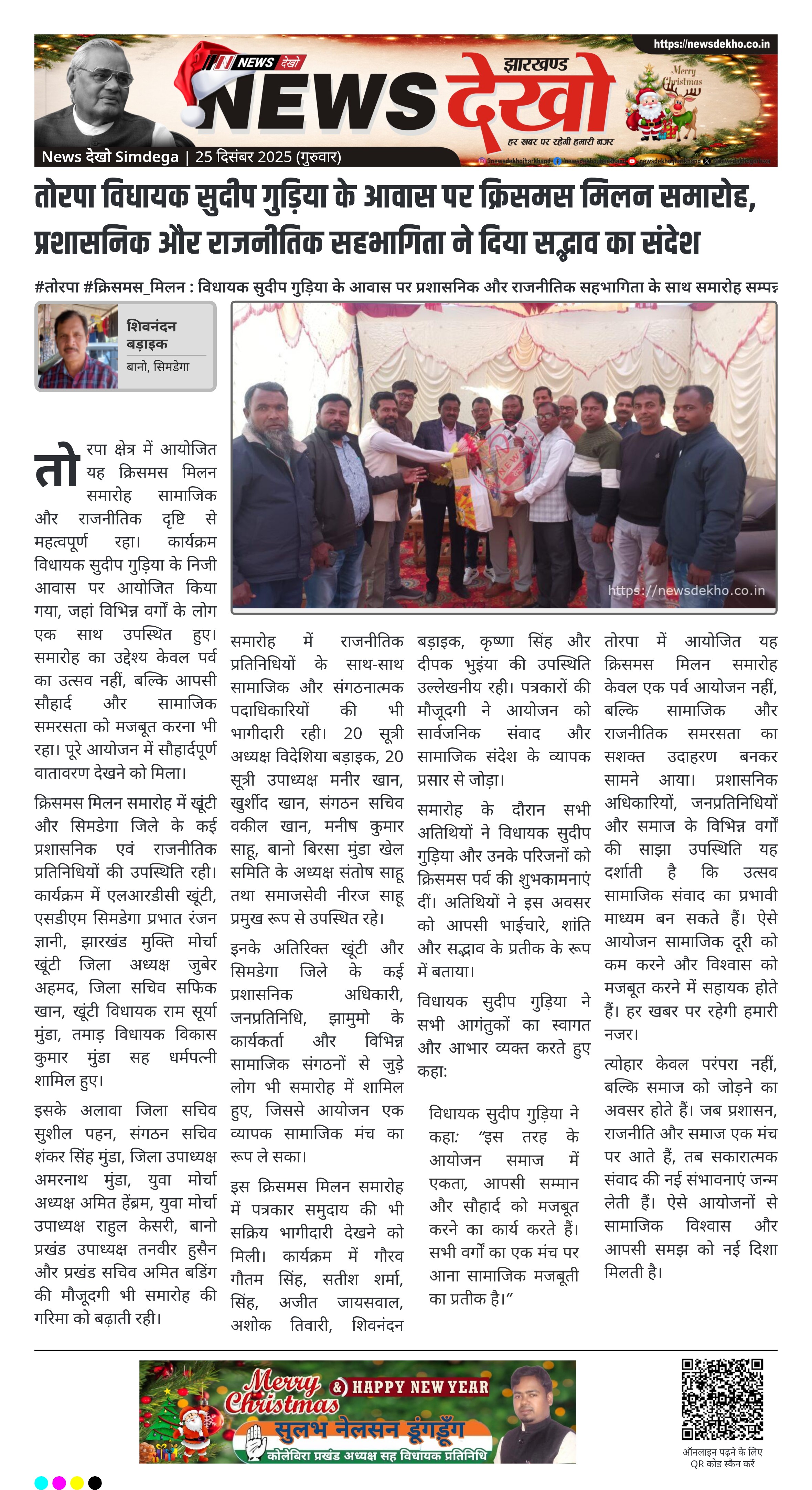 • तोरपा विधायक सुदीप गुड़िया के आवास पर क्रिसमस मिलन समारोह आयोजित।