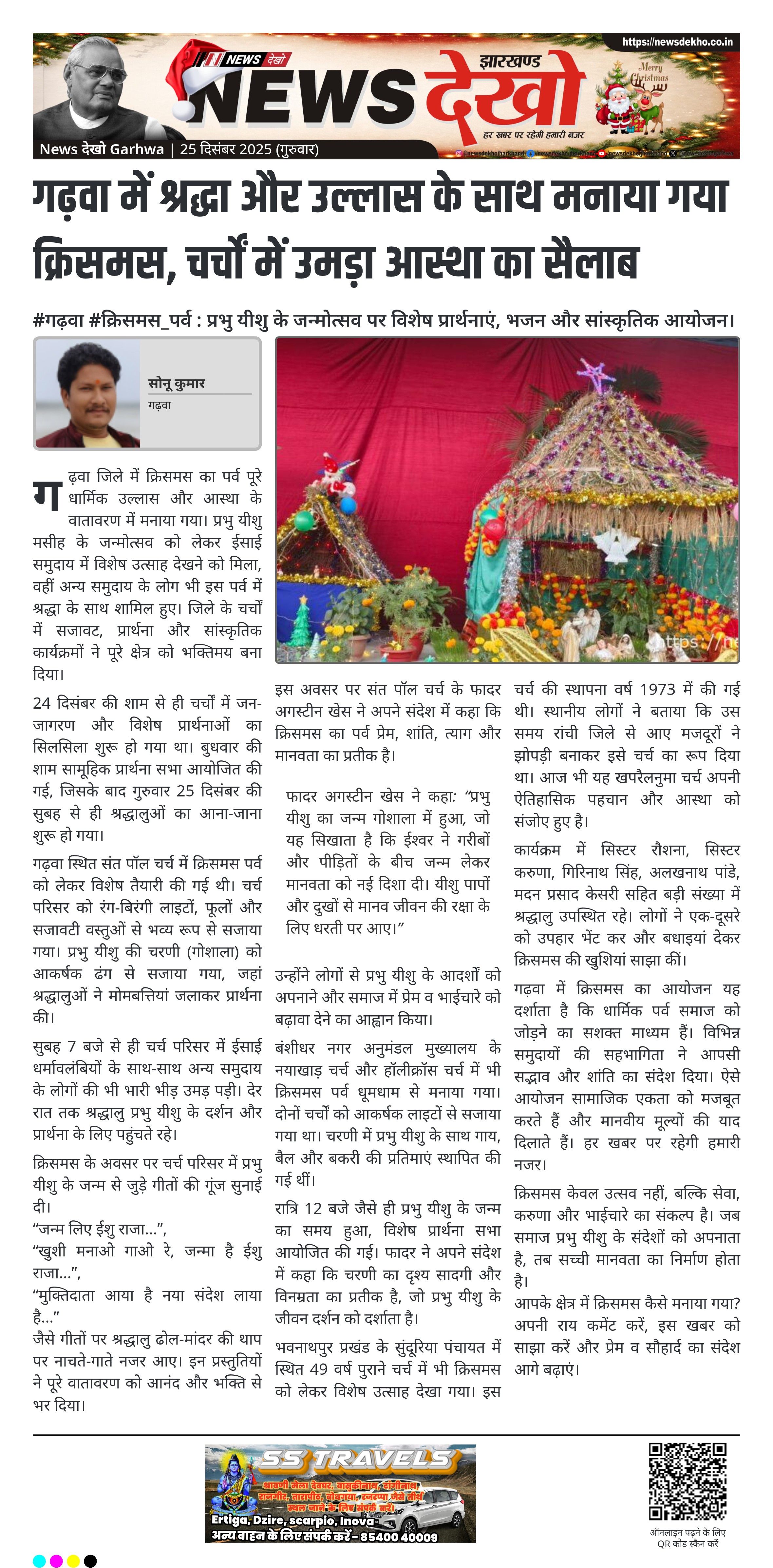 गढ़वा जिले में क्रिसमस का पर्व पूरे धार्मिक उल्लास और आस्था के वातावरण में मनाया गया। प्रभु यीशु मसीह के जन्मोत्सव को लेकर ईसाई समुदाय में विशेष उत्साह देखने को मिला, वहीं अन्य समुदाय के लोग भी इस पर्व में श्रद्धा के साथ शामिल हुए। जिले के चर्चों में सजावट, प्रार्थना और सांस्कृतिक कार्यक्रमों ने पूरे क्षेत्र को भक्तिमय बना दिया।