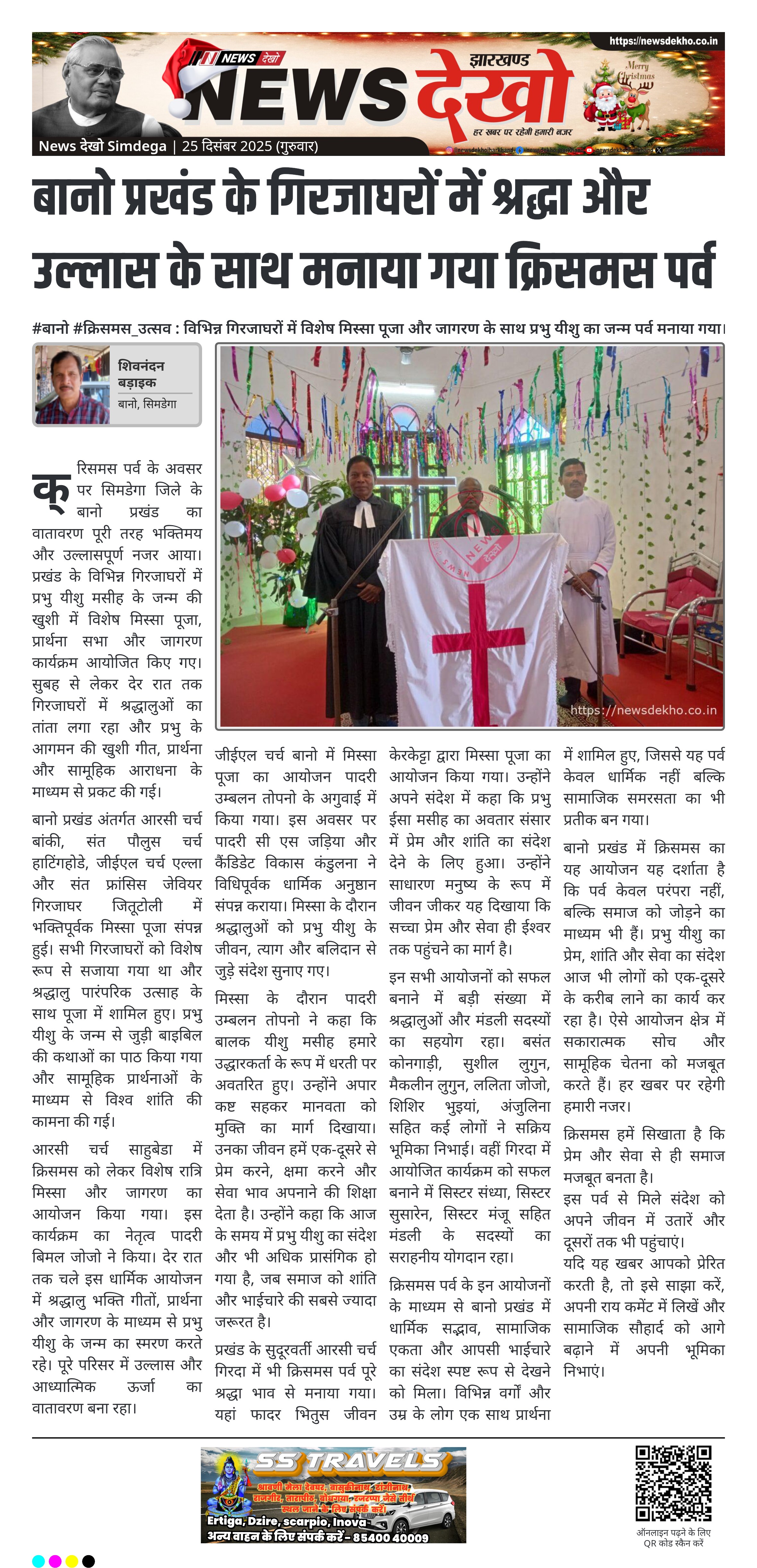 क्रिसमस पर्व के अवसर पर सिमडेगा जिले के बानो प्रखंड का वातावरण पूरी तरह भक्तिमय और उल्लासपूर्ण नजर आया। प्रखंड के विभिन्न गिरजाघरों में प्रभु यीशु मसीह के जन्म की खुशी में विशेष मिस्सा पूजा, प्रार्थना सभा और जागरण कार्यक्रम आयोजित किए गए। सुबह से लेकर देर रात तक गिरजाघरों में श्रद्धालुओं का तांता लगा रहा और प्रभु के आगमन की खुशी गीत, प्रार्थना और सामूहिक आराधना के माध्यम से प्रकट की गई।