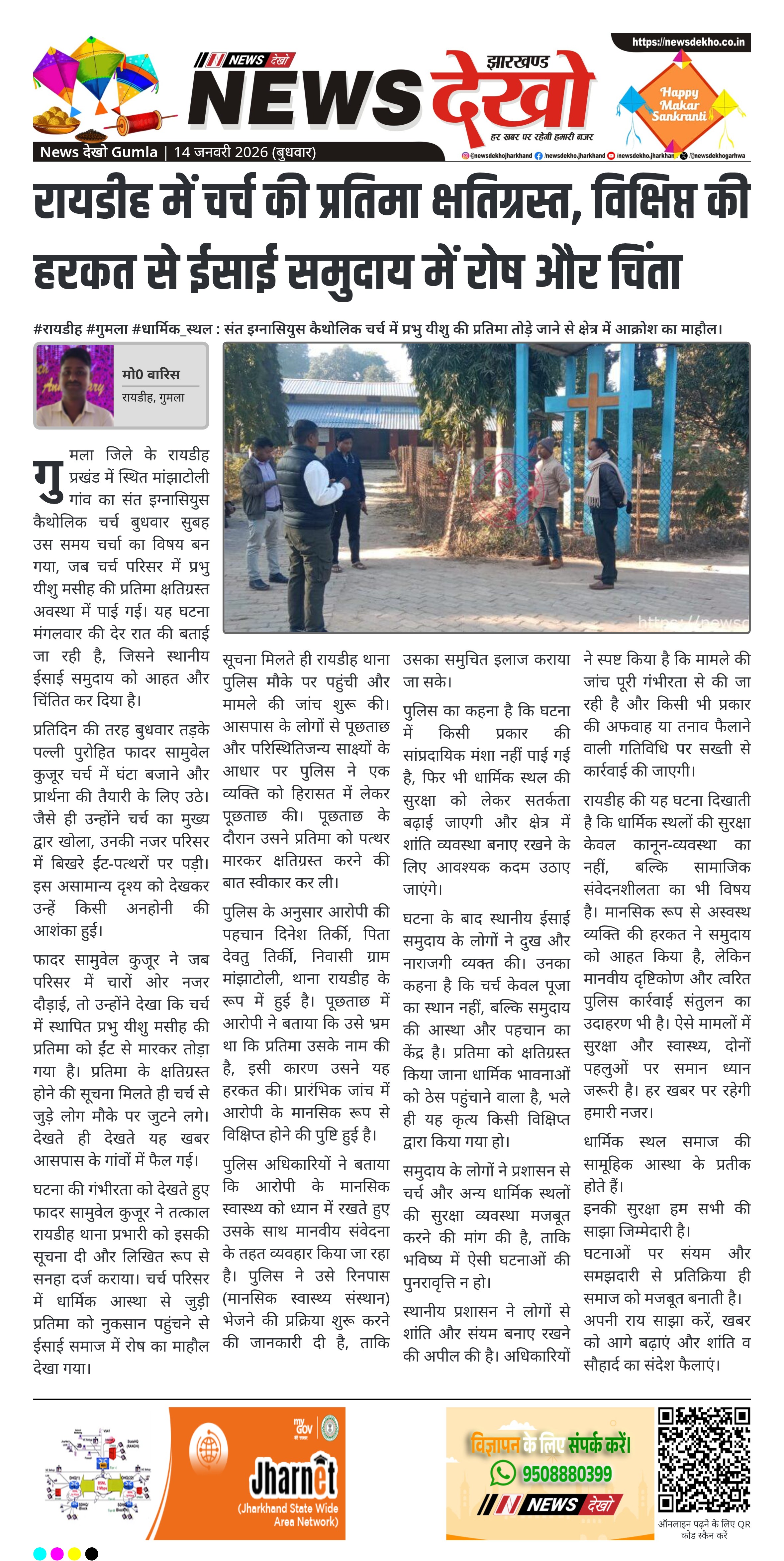 गुमला जिले के रायडीह थाना क्षेत्र अंतर्गत मांझाटोली स्थित संत इग्नासियुस कैथोलिक चर्च में मंगलवार देर रात एक विक्षिप्त व्यक्ति द्वारा प्रभु यीशु मसीह की प्रतिमा को क्षतिग्रस्त कर दिया गया। बुधवार सुबह घटना की जानकारी मिलने पर चर्च प्रबंधन ने पुलिस को सूचित किया। पुलिस ने त्वरित कार्रवाई करते हुए आरोपी की पहचान कर पूछताछ की, जिसमें उसने कृत्य स्वीकार किया। घटना से स्थानीय ईसाई समुदाय में रोष और धार्मिक स्थलों की सुरक्षा को लेकर चिंता व्याप्त है।