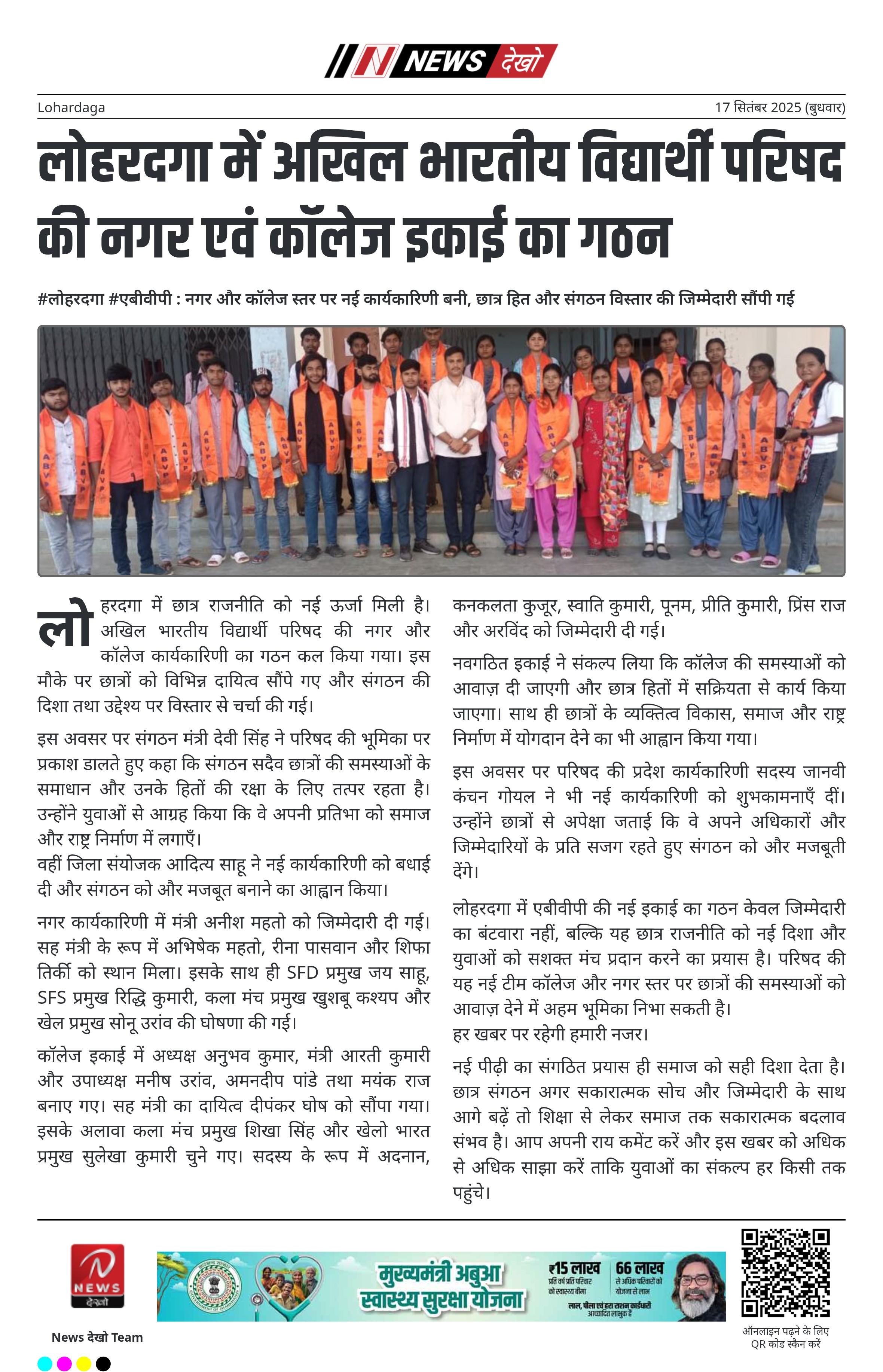 • लोहरदगा में अखिल भारतीय विद्यार्थी परिषद की नगर कार्यकारिणी और कॉलेज इकाई का गठन।