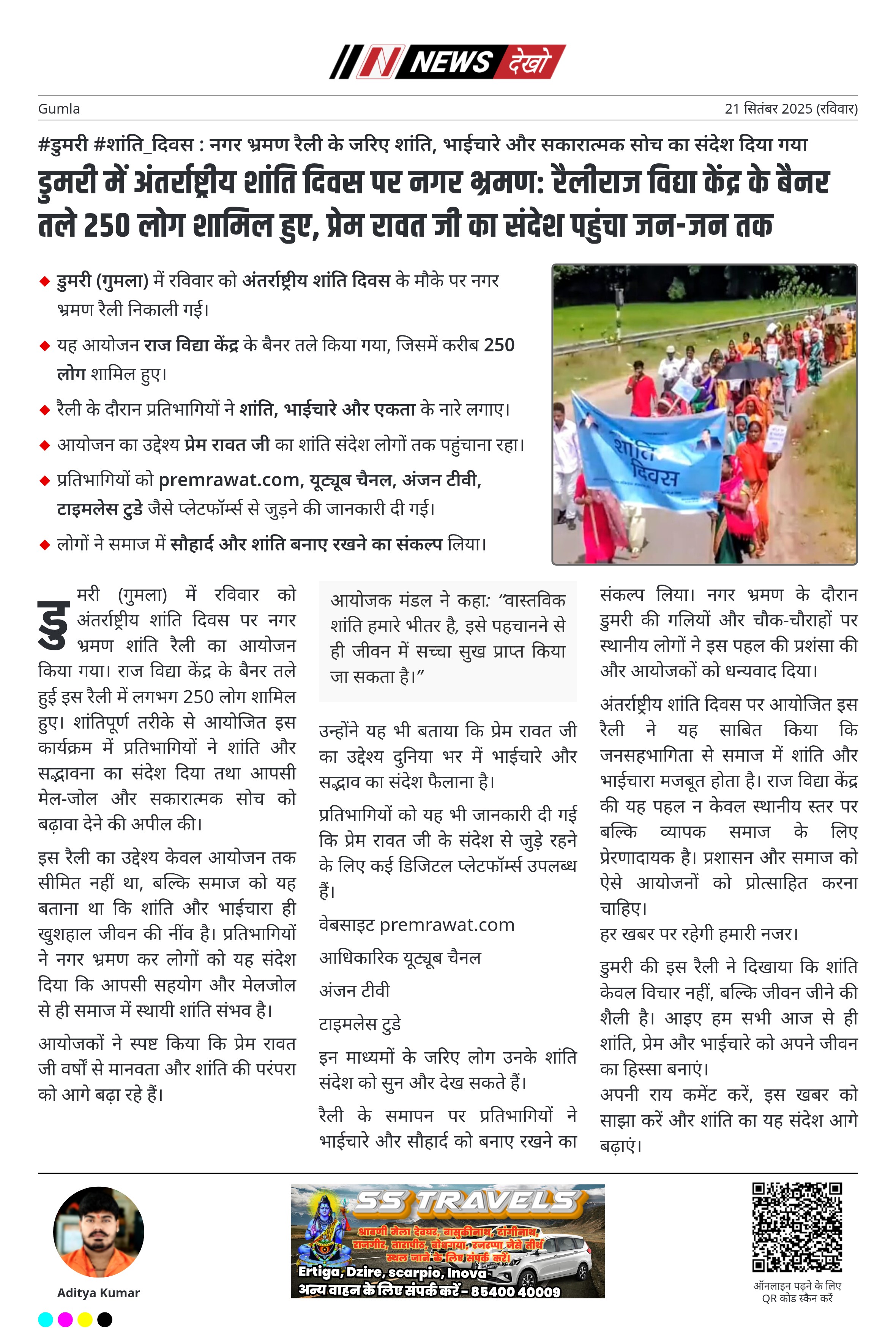 अंतर्राष्ट्रीय शांति दिवस पर आयोजित इस रैली ने यह साबित किया कि जनसहभागिता से समाज में शांति और भाईचारा मजबूत होता है। राज विद्या केंद्र की यह पहल न केवल स्थानीय स्तर पर बल्कि व्यापक समाज के लिए प्रेरणादायक है। प्रशासन और समाज को ऐसे आयोजनों को प्रोत्साहित करना चाहिए।