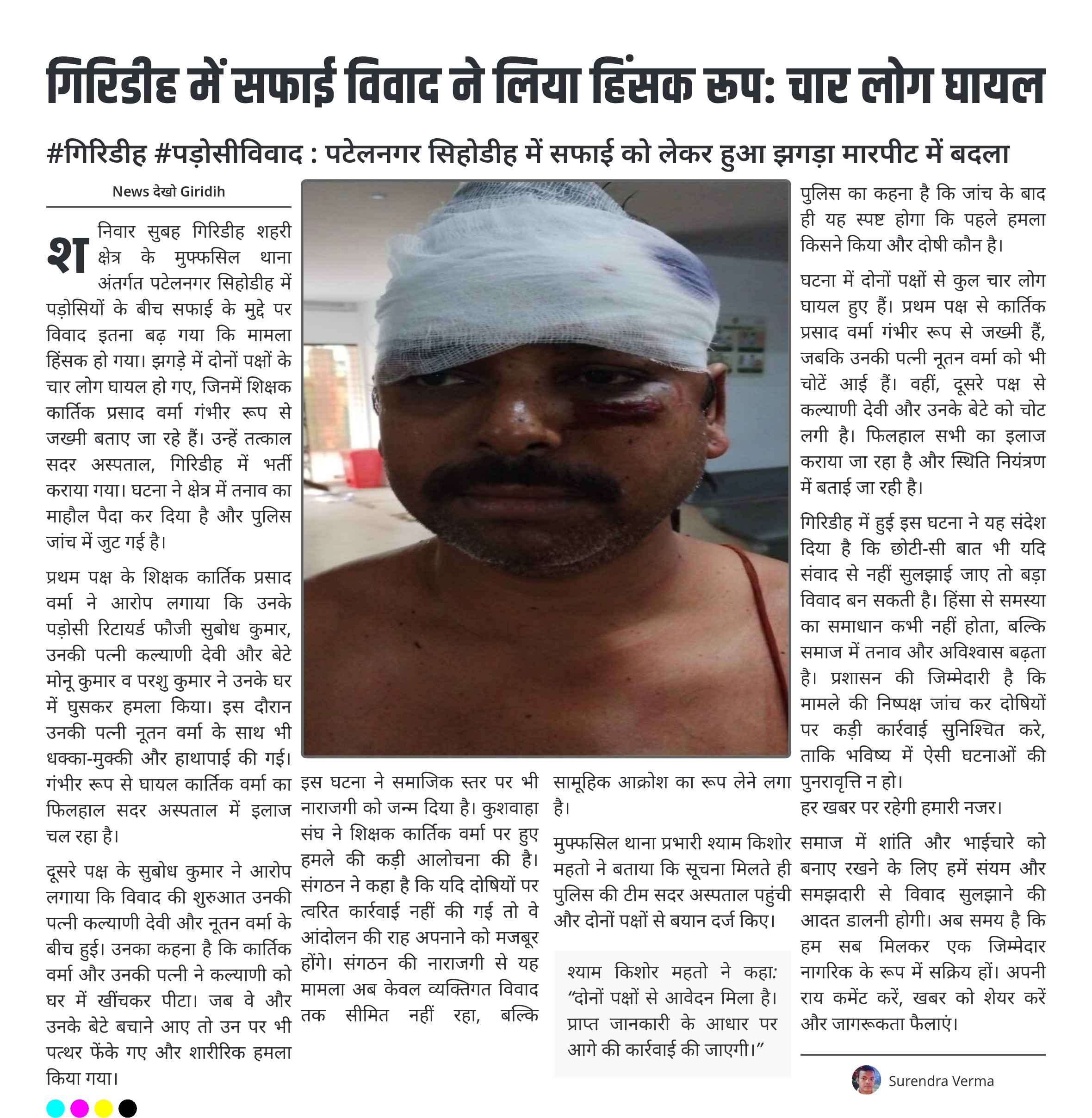 #गिरिडीह #पड़ोसीविवाद : पटेलनगर सिहोडीह में सफाई को लेकर हुआ झगड़ा मारपीट में बदला